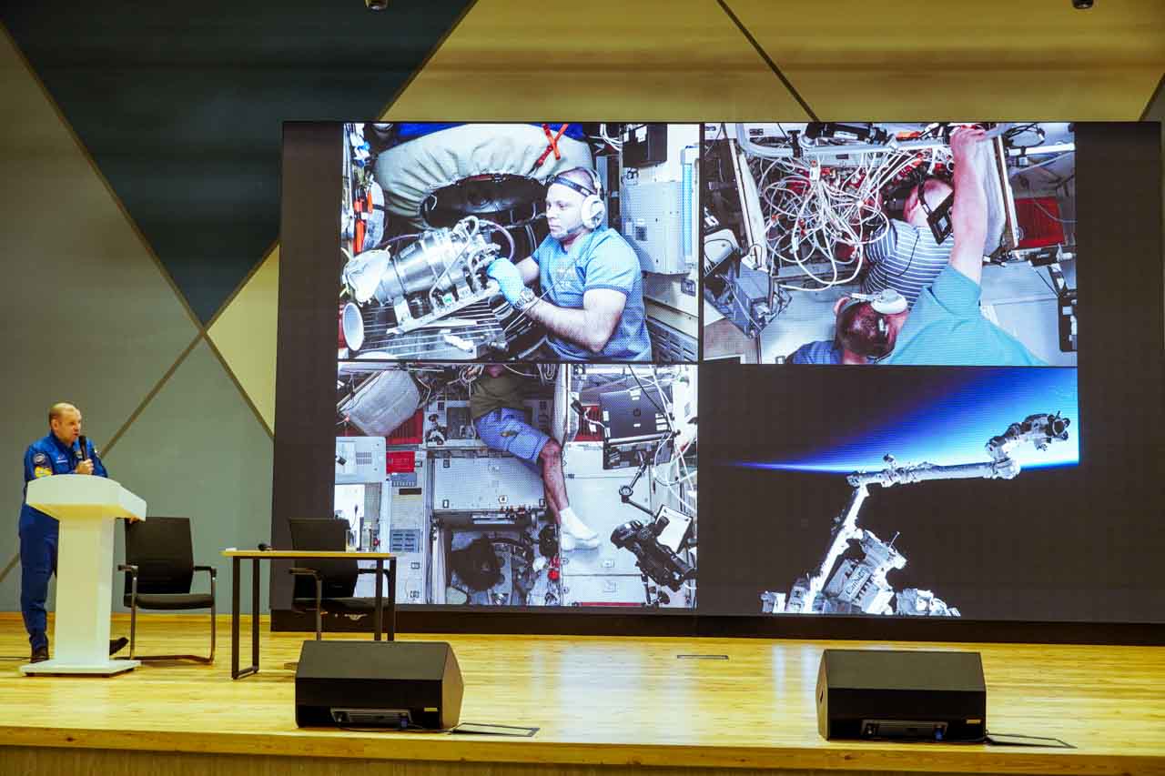 На экране – не учебные материалы, а вид на гималайские хребты из иллюминатора МКС, извержение вулкана, ночное сияние городов. А перед школьниками − космонавт Иван Вагнер, совершивший две длительные экспедиции на орбиту. Он просто и увлеченно рассказывает о своей работе, будто приглашая всех ненадолго на борт станции.