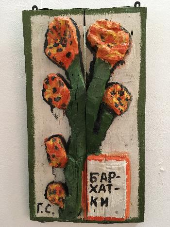 Так или иначе – нынче в «Х.Л.А.М.» процветает горшковская эстетика. Махровым цветом, на два галерейных зала. В первом гостят экземпляры «Гербария» – цикла, уже знакомого постоянному посетителю галереи. Тут же – брутальная инсталляция «Цветы на асфальте». На мой взгляд – пугающая: разноцветные бутоны на прямых кряжистых стеблях заострены пиками, нарочито устремленными ввысь. В Вечность, так сказать. Получается – вот она, цветущая жизнь на корню, которая «растет» и движется по направлению знамо куда…
