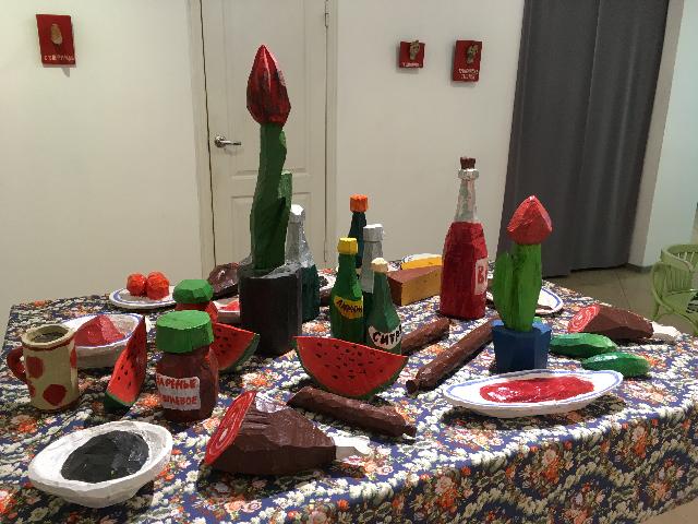 В этом анатомическом окружении, аккурат посреди комнаты – стол, плотно заставленный яствами и напитками: какой же, в самом деле, юбилей без застолья? Инсталляция «Пир», эдакая скатерть-самобранка – от селедки под шубой до спелого арбуза. И ведь все вольности, они же нелепости, художнику не то что прощаешь – беспрекословно воспринимаешь как посыл к действию. «Кушать подано» таким вот странным образом – отчего ж не покушать? Спасибо!..