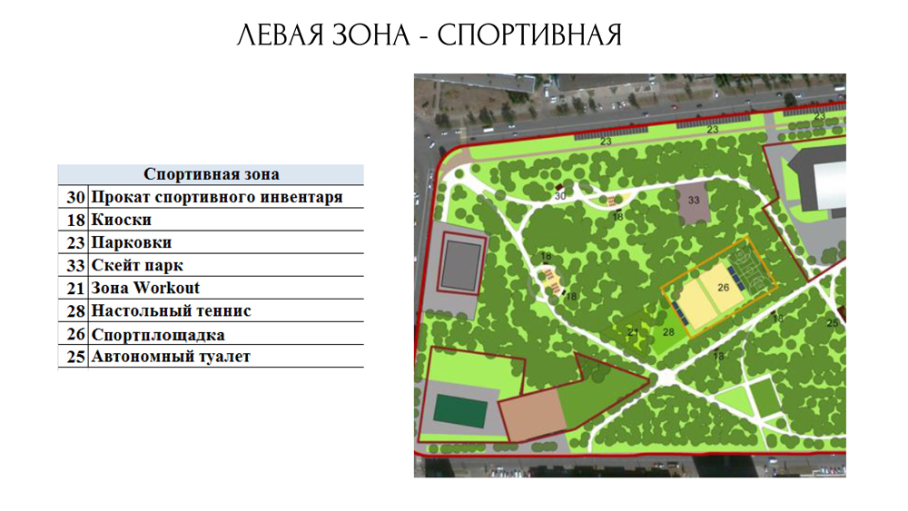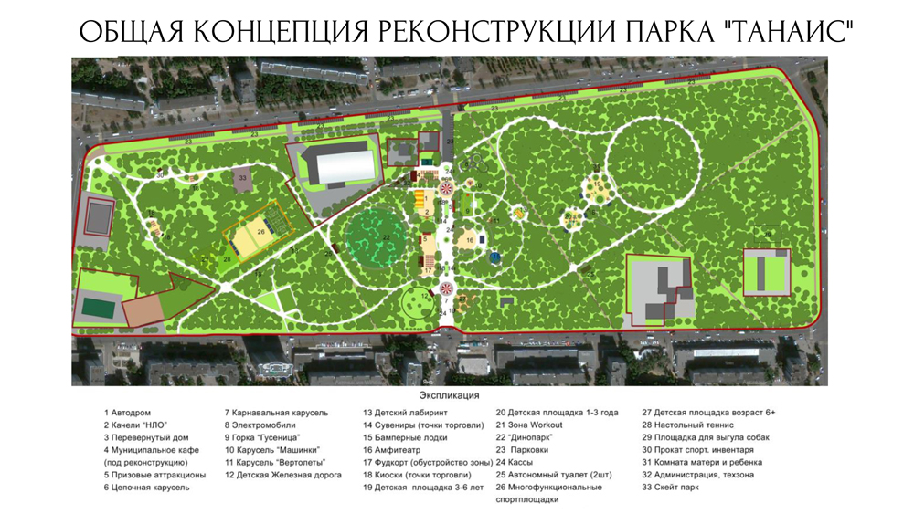 Концессионер предлагает разместить новые локации. Как пример - Динопарк, детский лабиринт и «Перевернутый дом». Левая сторона уже отчасти является спортивной – там есть спортивная площадка, наполнение предлагается значительно увеличить – организовать прокат инвентаря, зону для воркаута, футбольное и волейбольное поля, в зимнее время там будет заливаться каток. В «Танаисе» может появиться и скейт-парк – таких объектов в городе большой дефицит. Также горожане просили оставить территорию для настольного тенниса на своем месте, где им удобно играть и они уже десятилетиями там располагаются – это пожелание учтено.