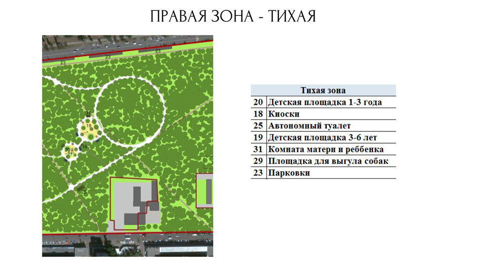 Правая сторона будет зоной тихого отдыха и прогулок – именно так она и используется в настоящее время. Кардинально менять здесь ничего не будут, однако планируется установить детские площадки для малышей от года до трех лет, и для детей от трех до 6 лет, появится комната матери и ребенка, рассматривается возможность создания локаций для тихого развлечения детей, например, веревочный городок. На отдалении от этих мест предусмотрена площадка для выгула собак.