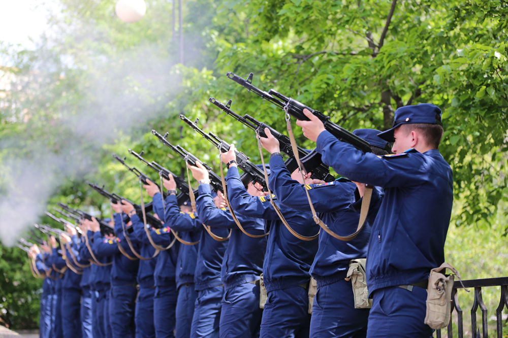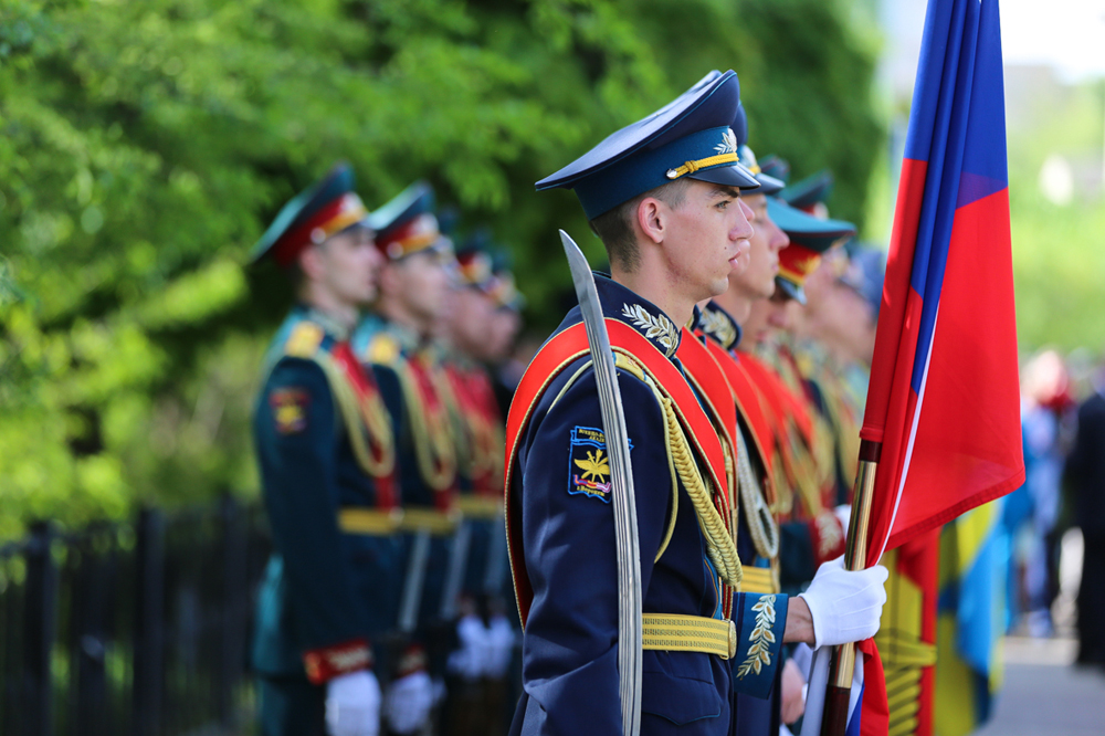 Под залпы оружейного салюта военный оркестр исполнил государственный гимн, а почетный караул курсантов прошел торжественным маршем.