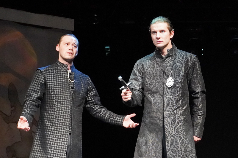 Разгневанный от несказанных любимой дочерью Корделией (актриса Мария Щербакова) слов, Лир (худрук драмтеатра Владимир Петров) «упивается» собственным страданием, пока старшие дочери «примеряют» его земли, словно платья. Придумана эта сцена с глубоким знанием женской психологии, а потому получилась весьма иронично. «Дуэт» сестер (Светлана Поваляева и Магдалена Магдалинина) – яркое воплощение лицемерия и холодности, обе показаны без намека на способность любить. Лишь в конце, когда Гонерилья (Поваляева) сама лишит себя жизни из-за любви, понимаешь, что и ей доступны человеческие благородные чувства.