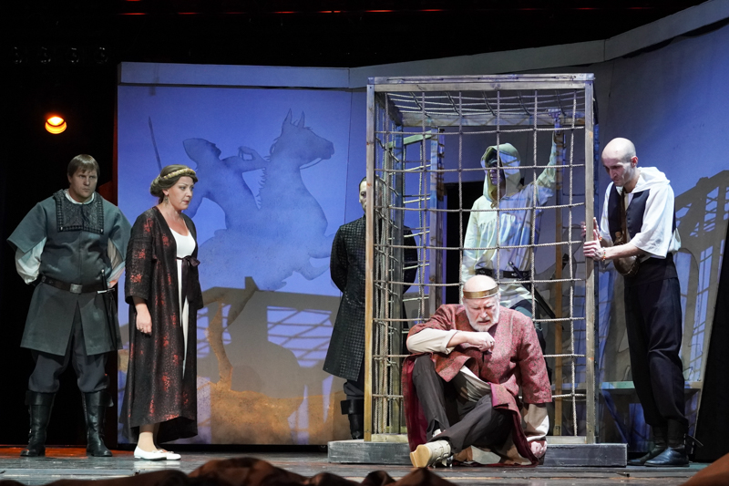 В спектакле занята практически вся мужская труппа театра. Но особенно хочется отметить Сергея Карпова, сыгравшего роль графа Глостера. Оказавшись, как говорится, между молотом и наковальней, хранивший преданность Лиру до конца его дней, граф умел сохранить достоинство. Мастерство Сергея Карпова – в щепетильности подхода к каждой детали: вы только посмотрите, как выполнен поклон Гонерилье!