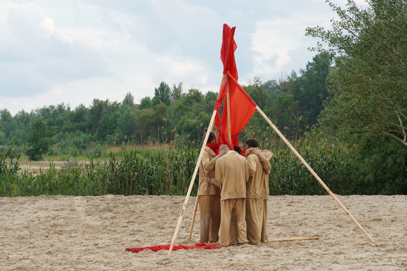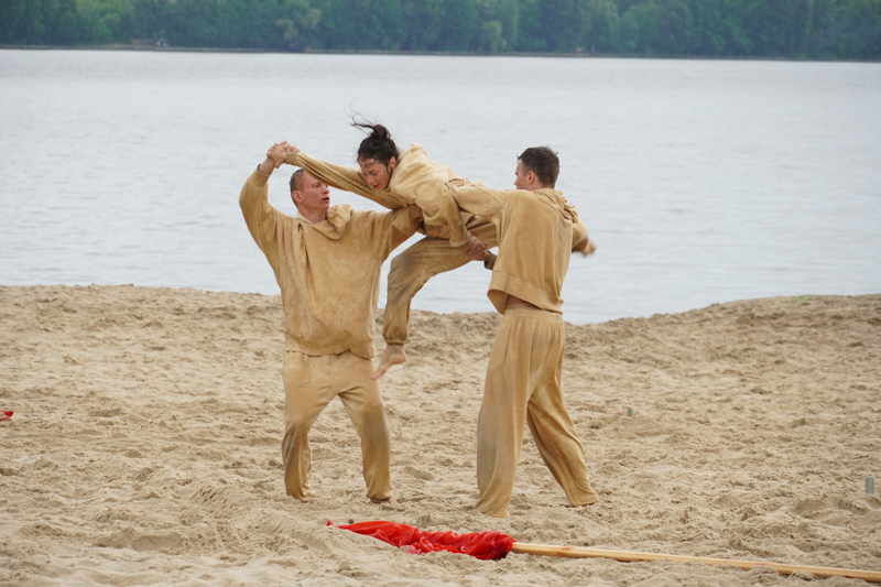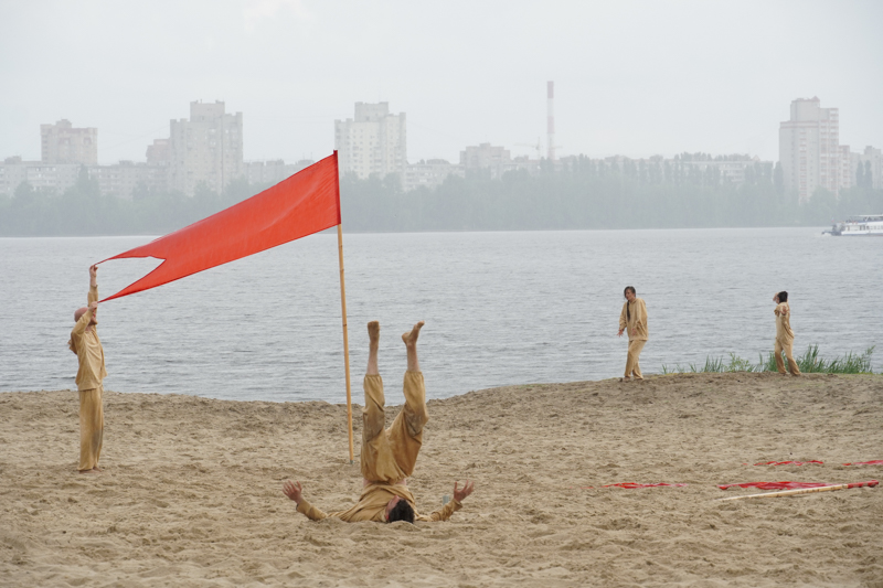 Естественная декорация из песка, воды и дождя, который начался почти на старте представления, по задумке хореографа Анны Щеклеиной, очень созвучна Андрею Платонову, который в своих текстах часто обращается к описаниям облика человека, соприкоснувшегося с природой.