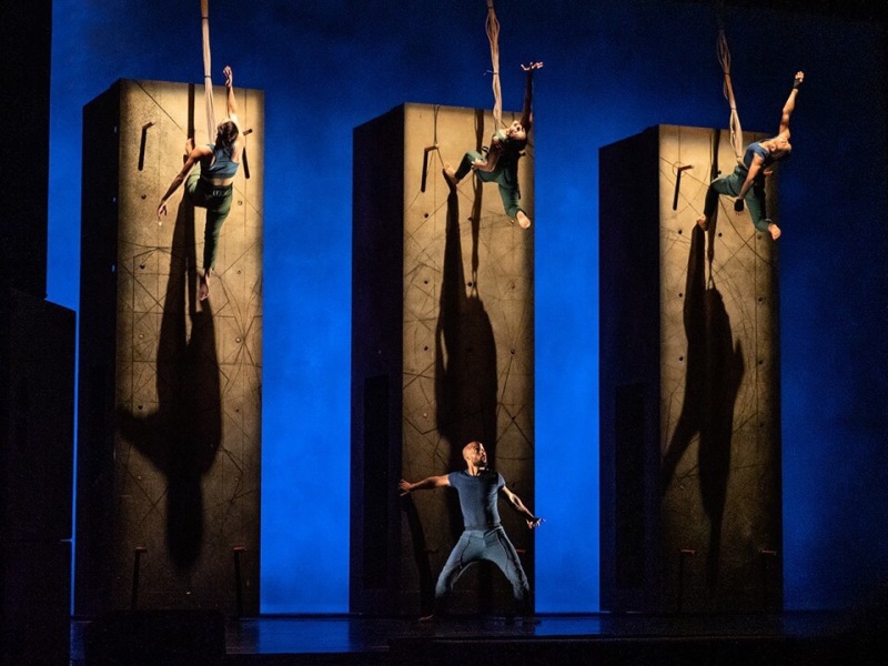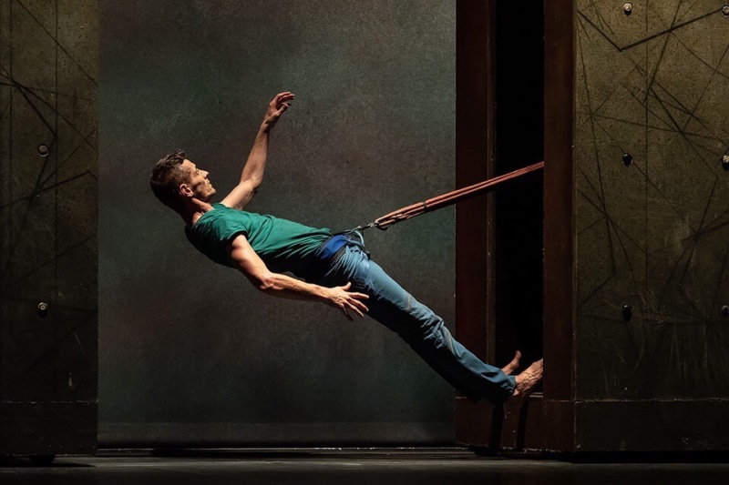 На сцене четырехтонная конструкция, которая, возможно, отвлекает внимание зрителей, но она является и непосредственным участником воздушного представления. За декорацией скрыт противовес, к которому крепятся лонжи, да и сама «коробка» становится приспособлением для выражения себя с помощью танца.