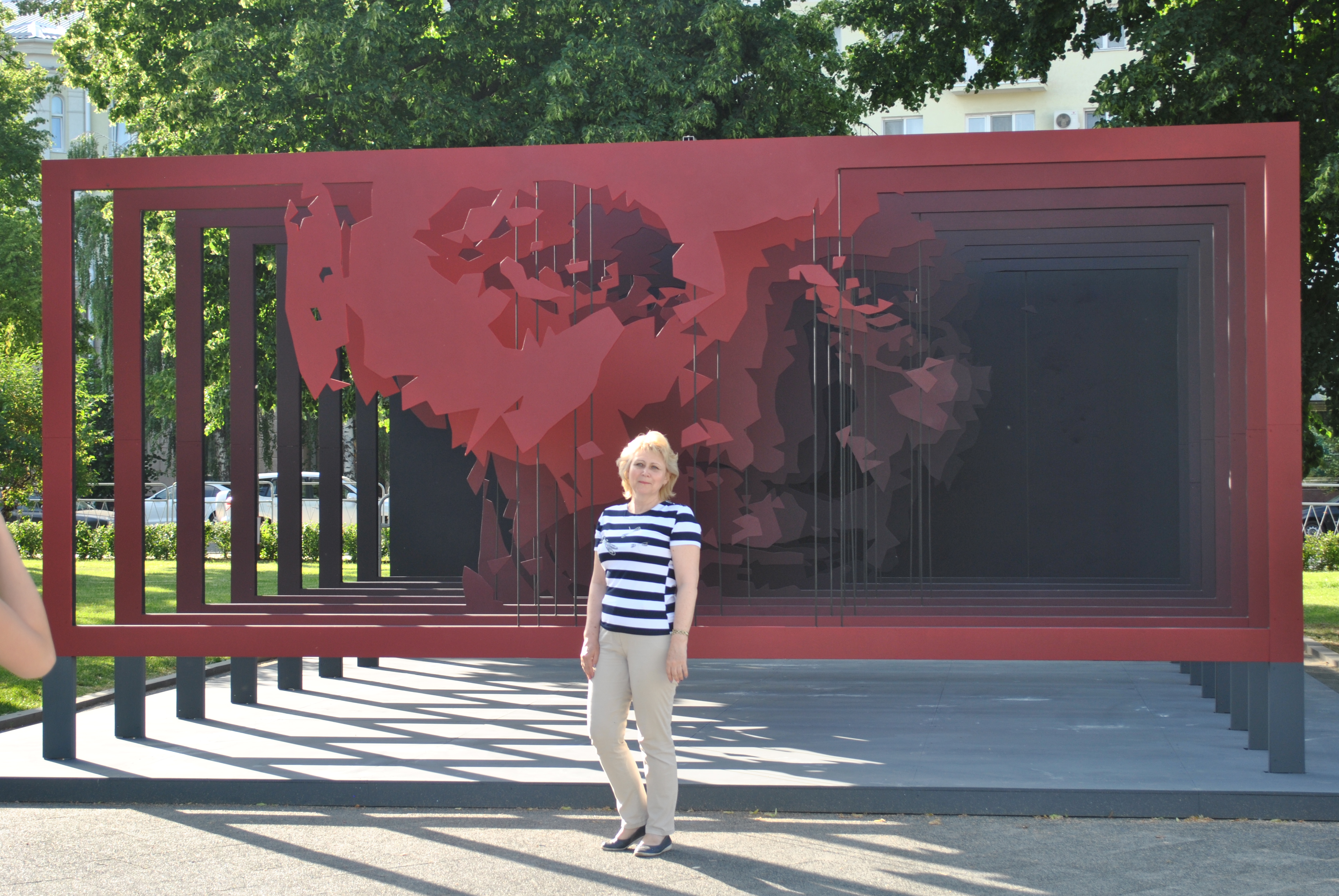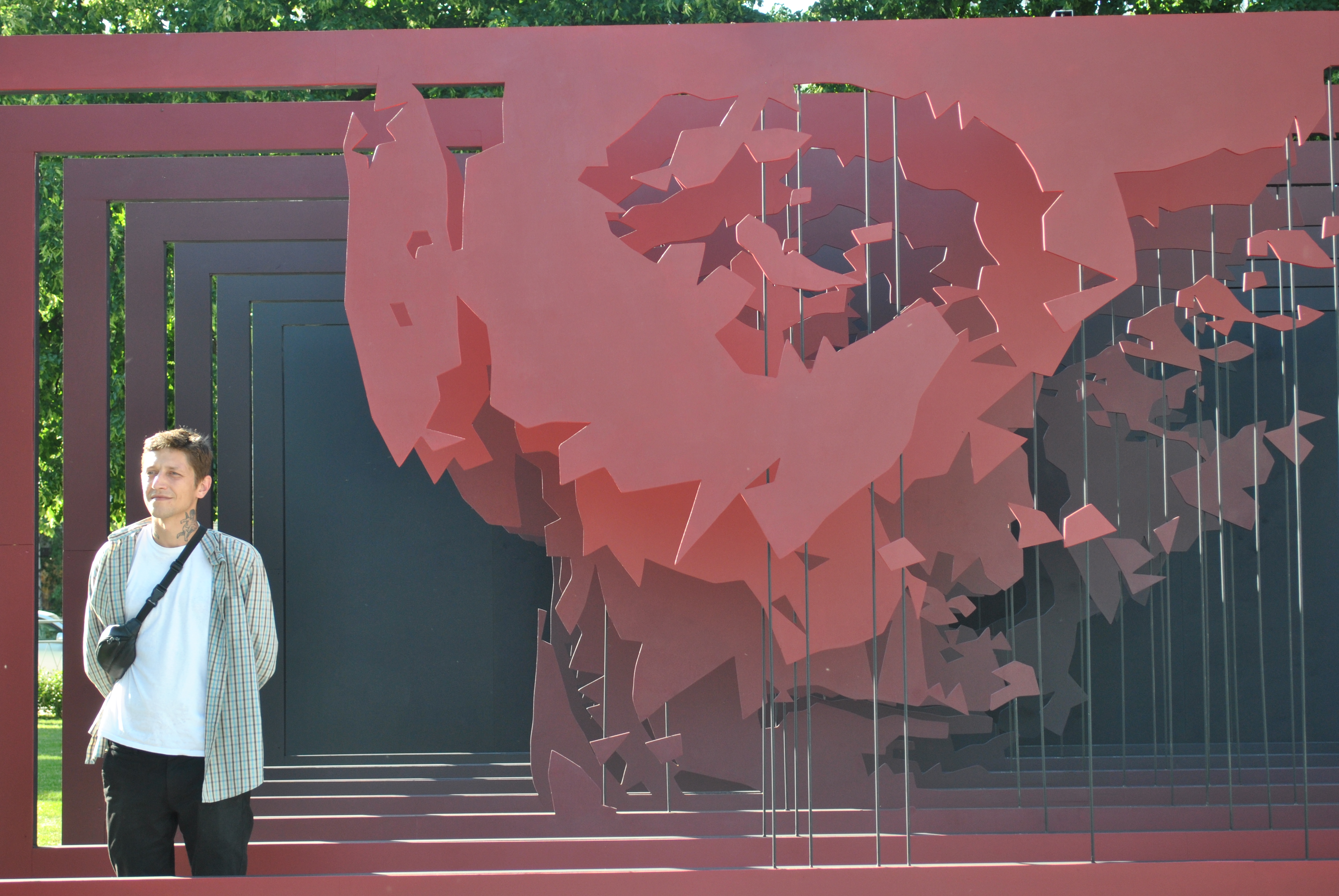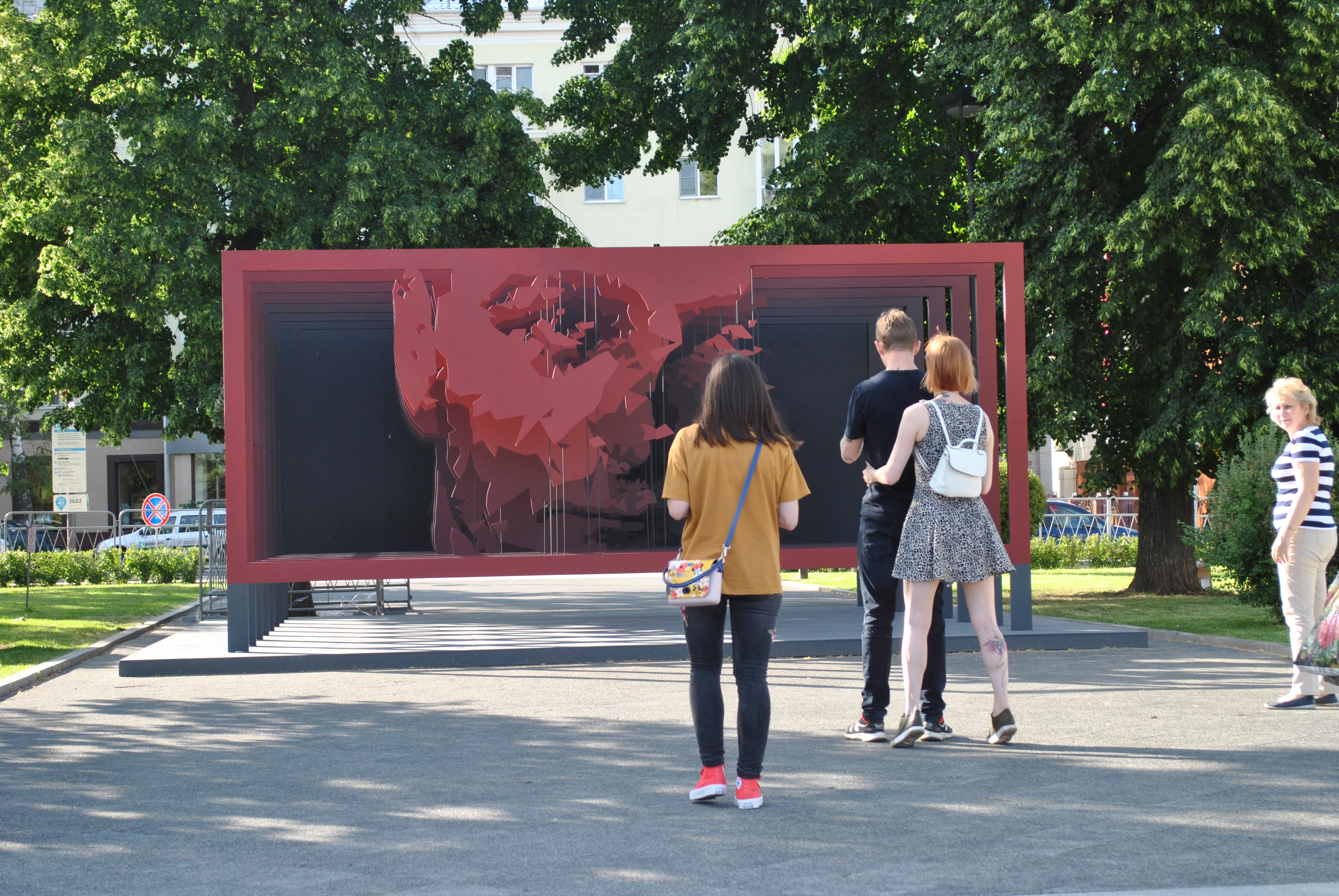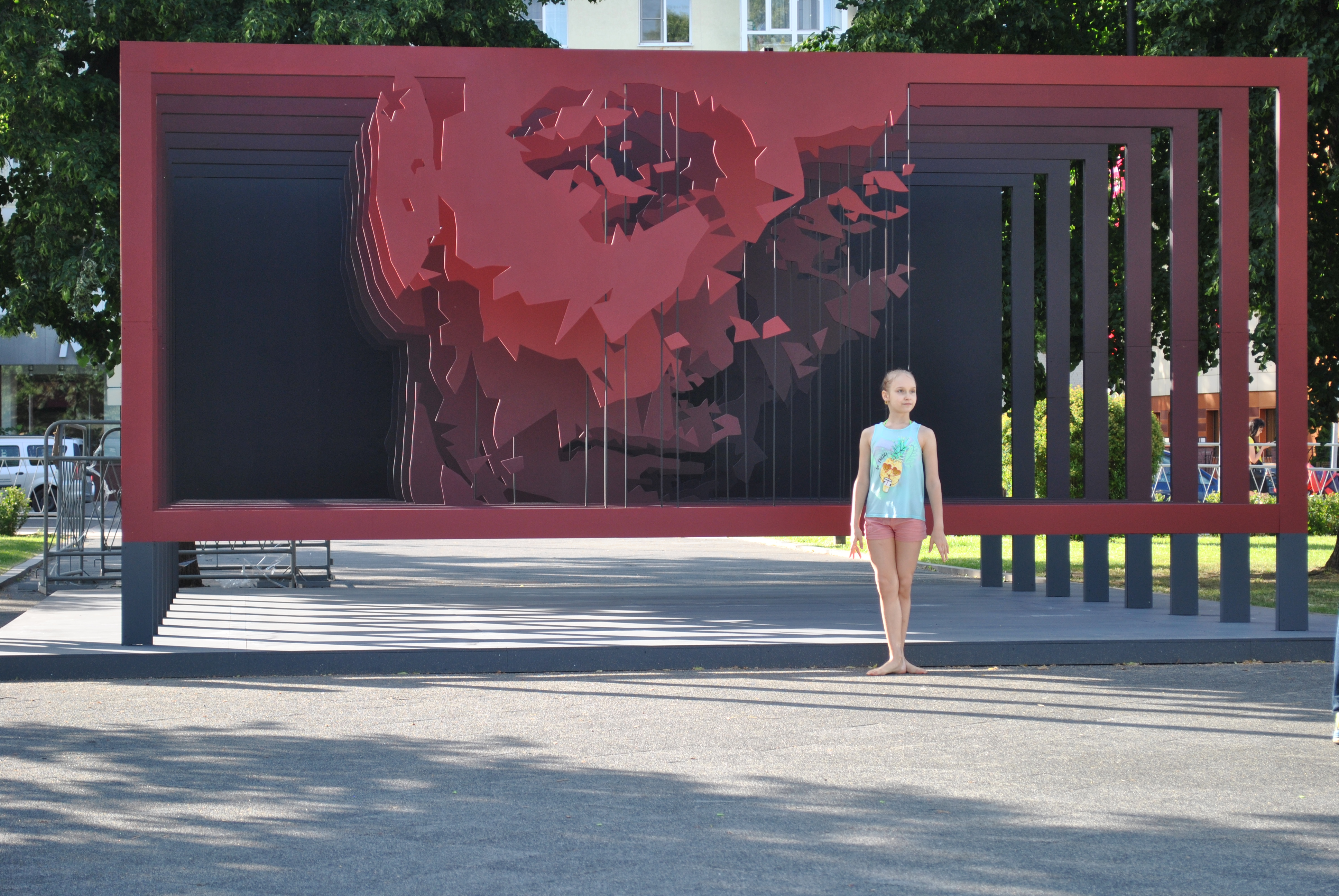 Сам художник в нашем городе с понедельника. Он контролировал процесс сборки портрета, а также занимался его покраской. Инсталляцию перекрашивали за это время несколько раз, стараясь добиться правильного эффекта. Цельную картину, разбитую на слои и вписанную в городской рельеф, можно увидеть с определенной точки обзора – там, где составные части соединяется воедино. Но увидев, уже не «развидишь».