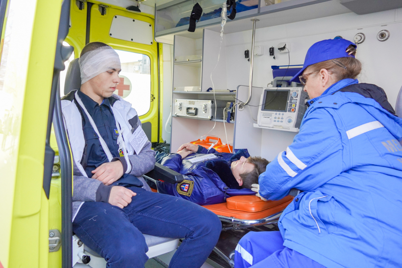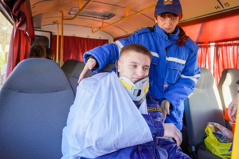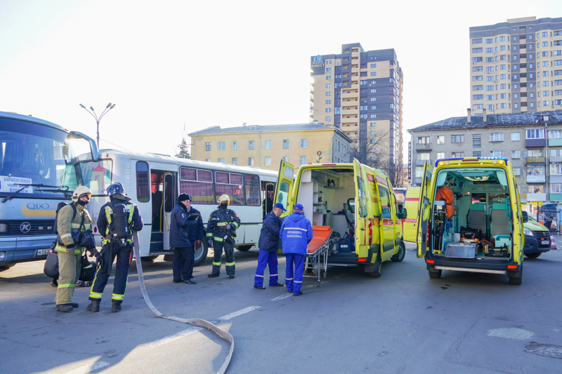 По легенде, в районе автовокзала столкнулись два автобуса, перевозящие пассажиров. В одном из них произошло возгорание, в другом оказались заблокированы раненые пассажиры. В результате аварии пострадали 20 человек.