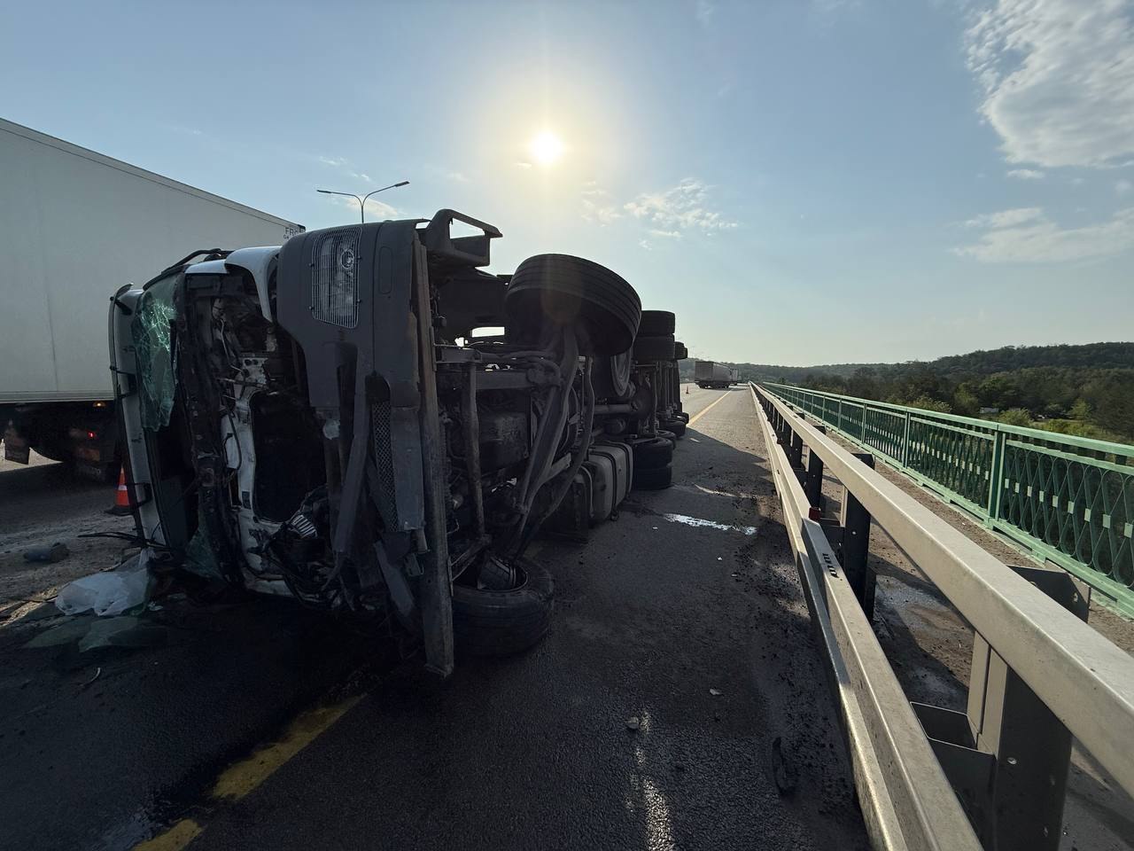 Как стало известно из сообщения пресс-службы регионального ГУ МВД, происшествие случилось ориентировочно в половине четвертого дня. За рулём большегруза находился 51-летний мужчина из Татарстана, который потерял контроль над машиной Mercedes-Benz Axor с прицепом — автомобиль съехал с проезжей части и лег набок, заблокировав проезд другим транспортным средствам.
