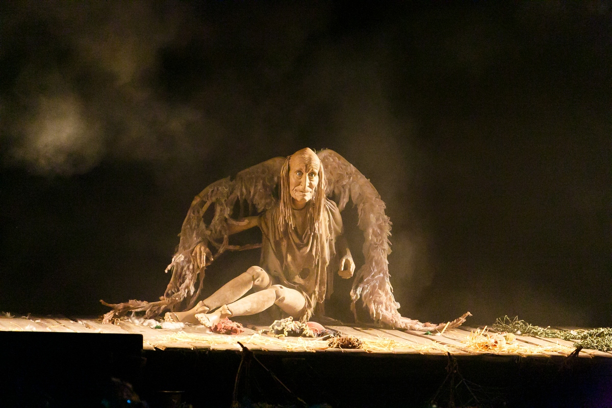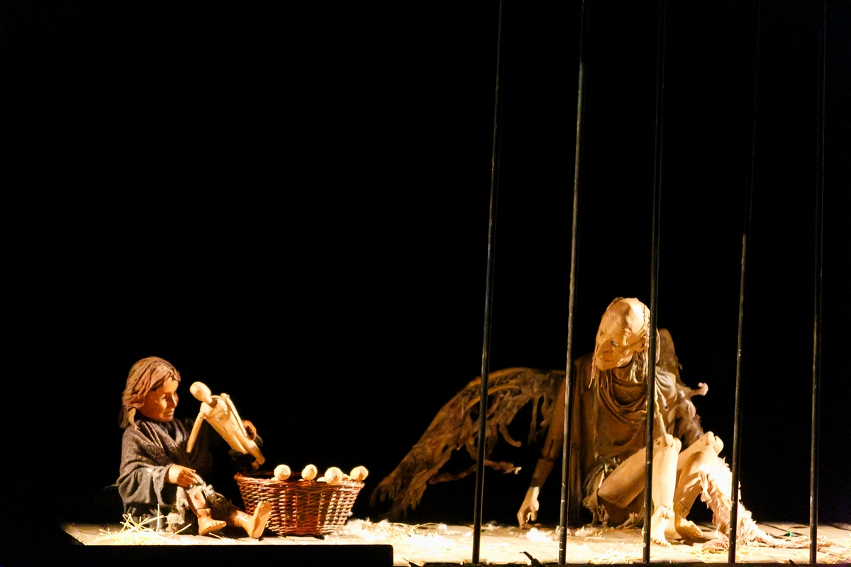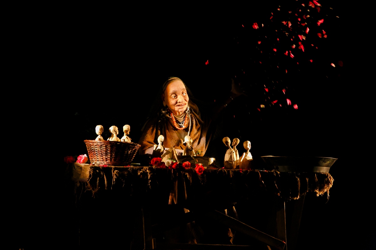 Эти куклы танцуют, создают эффект замедленной съемки и даже способны сделать сальто. Они настолько реалистичны, что руку актера, которая возникает, когда старуха за деревянным столом с трубкой во рту (вторая притча) переставляет человеческие фигурки, воспринимают как «кукольную» и удивляются – как же это возможно?! Неужели старуха сама способна переставлять предметы?