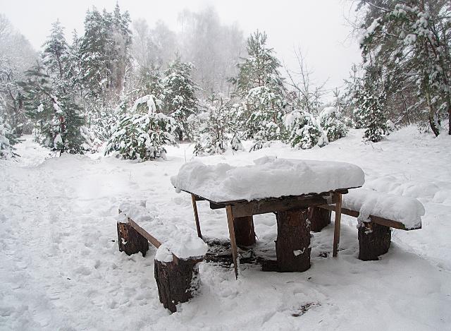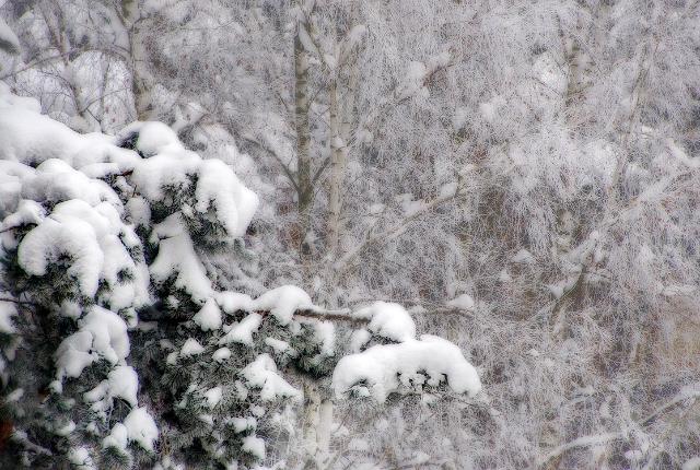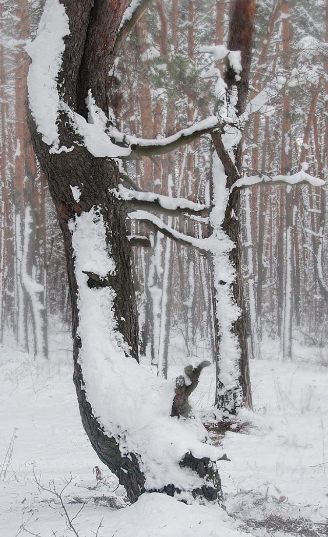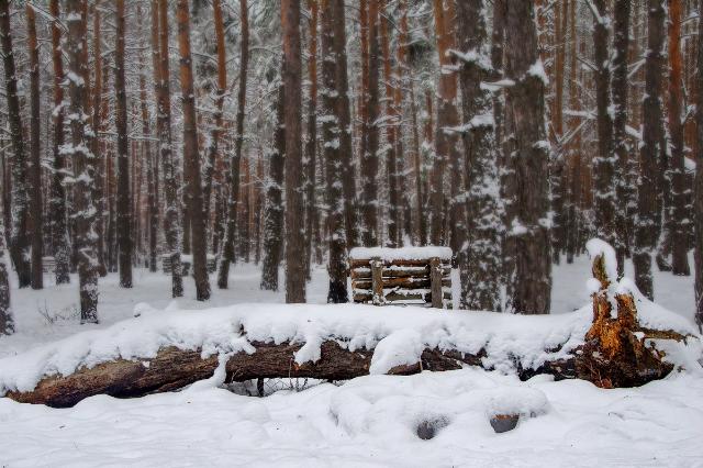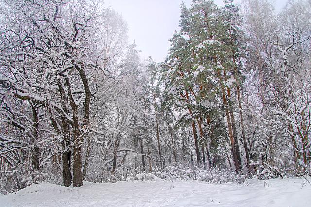 А вокруг – снежное царство. Сочетание хвойного и лиственного леса создавало поистине сказочную картину. Снег здесь не то что в городе – непорочно чист и девственно нетронут. А ещё – нечеловеческая тишина. Нет и признака ветерка. Ели с нахлобученными снежными шапками неожиданно контрастировали с голыми чёрными стволами дубов. Вологодскими кружевами опутаны хвойные иголки. Поваленные деревья и пеньки, заботливо укрытые снежным одеялом, напоминали непроходимые дебри.