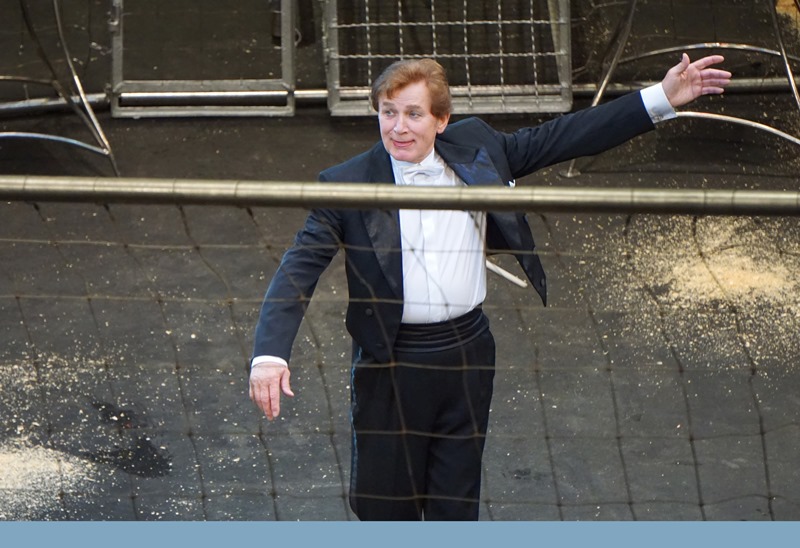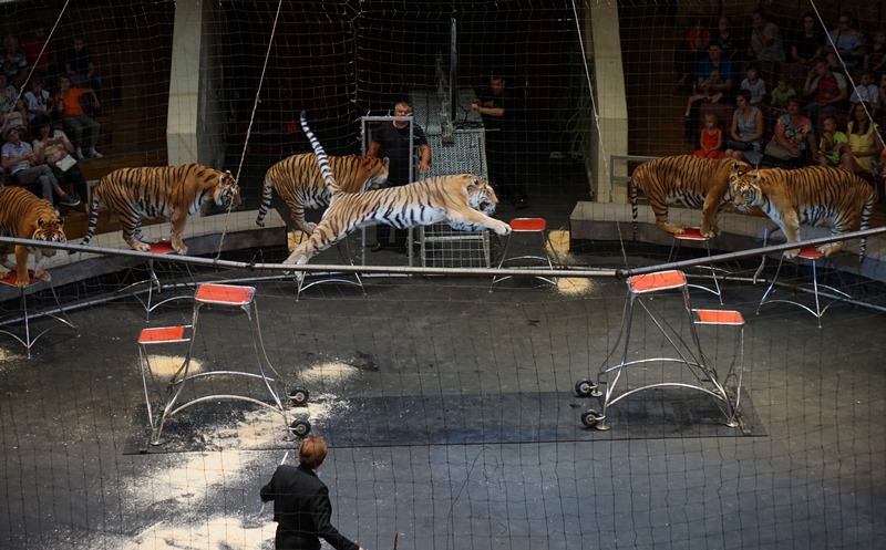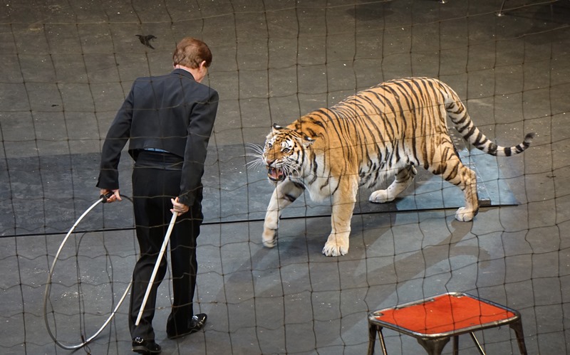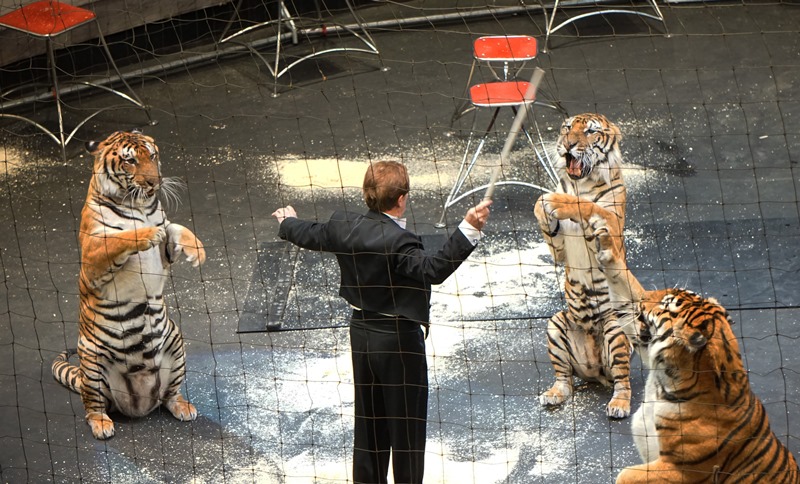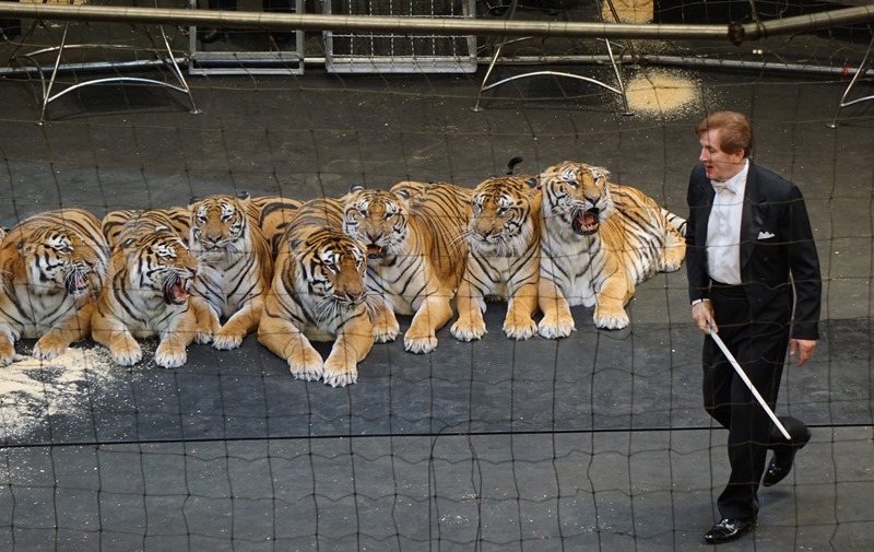 У меня 12 тигров один за одним прыгают в кольцо. Причем это большая дистанция, и они идут один за другим, голова в голову. А некоторые дрессировщики хвалятся тем, что у них прыгает через горящее кольцо всего один тигр, да и то на метровую дистанцию. У нас дистанция больше 3 метров. Также они выкладываются ковром, а потом по мановению дирижерской палочки веером идут по манежу. У меня есть номер, где тигр идет на меня, сейчас сделал – три тигра идут на меня. Агрессивно, как бы нападают. И в конце надо сделать так, чтобы они начали пятиться назад...