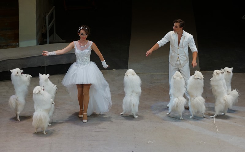 Детвору приводит в неописуемый восторг большая группа дрессированных японских шпицев, руководят которыми Анастасия и Максим Минасовы. Эти очаровательные белоснежные пушистики достались молодым артистам от Николая Павленко. Шпицы очаровывают сами по себе — ухоженные, красивые, и кстати, все — чемпионы, обладатели множества титулов и наград, с потрясающими родословными. А еще у них всегда приоткрыт рот, отчего создается впечатление, что они постоянно улыбаются.
