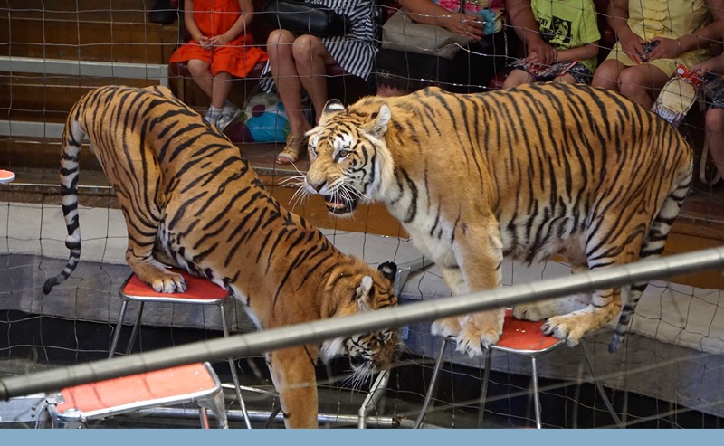 Гвоздем программы является, конечно же, аттракцион «Шоу гигантских тигров». На манеже под дирижерскую палочку «маэстро» выполняют сложнейшие трюки 12 полосатых хищников! Кстати, Павленко — единственный дрессировщик в мире, кто занимается именно суматранскими тиграми. Ведь несмотря на их довольно миниатюрное телосложение, они гораздо агрессивнее своих полосатых собратьев. При этом грозные киски с легкостью выполняют команды "маэстро" — ходят по кругу «веером», одновременно укладываются в одну шеренгу, один за другим прыгают через горящий обруч… Впрочем, порой скалят клыки, рычат, хорохорятся… Но создается ощущение, что это тоже часть дрессуры. Зал вздыхает с умилением, когда эти грозные хищники словно домашние котятки становятся перед Николаем Павленко на задние лапки, застенчиво подгибая передние. Смотреть на эту идиллию – одно удовольствие!