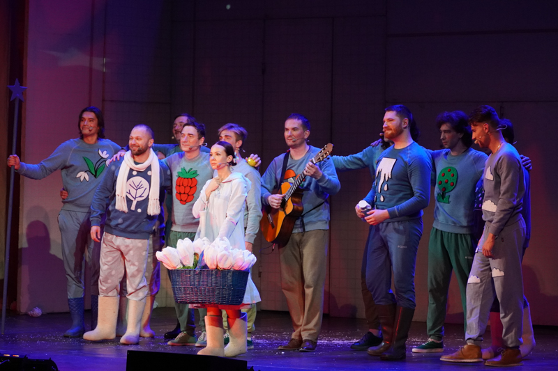Постановка позволила зрителям вновь встретиться с хорошо знакомыми героями – капризной принцессой, мачехой, ее дочкой и падчерицей и, конечно, с братьями-месяцами. Месяцы предстали перед Настенькой и зрителями словно картины, в расписных костюмах. А изображена на них – мать-природа, законы которой никакой хитростью и указами не обойти. Из прочей сценографии – использование видеопроекции, которая то переносит нас в покои принцессы, то, не жалея, бросает в центр метели. На сцене много самой обычной бумаги – простор для детской фантазии. Это и подснежники, и снежки, и даже головные уборы.