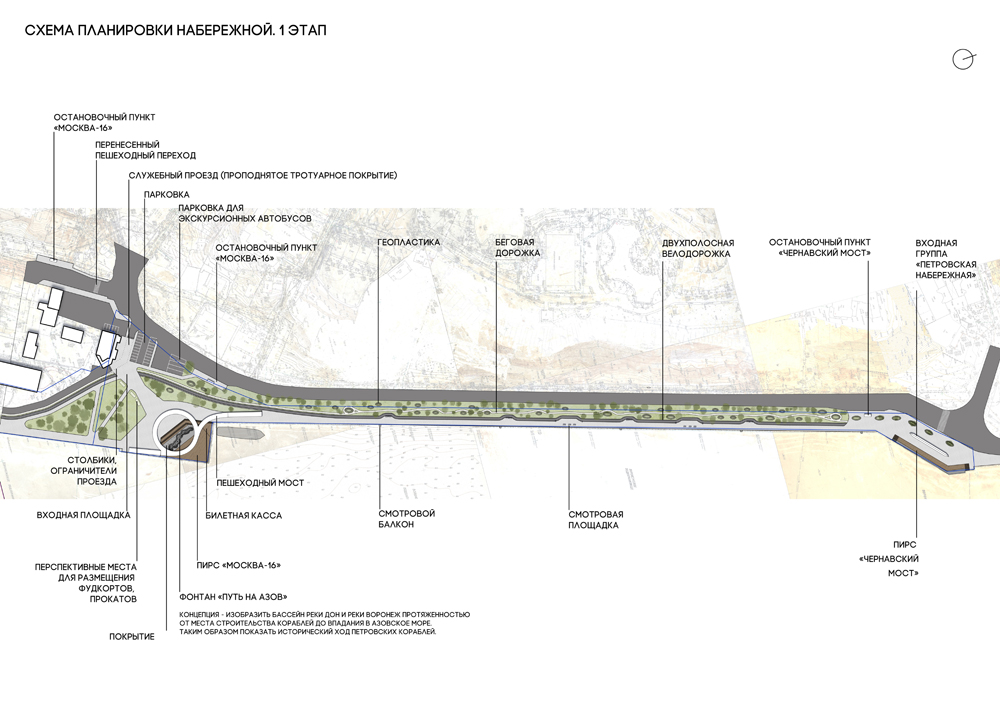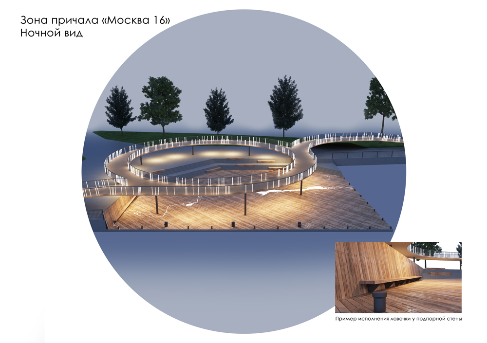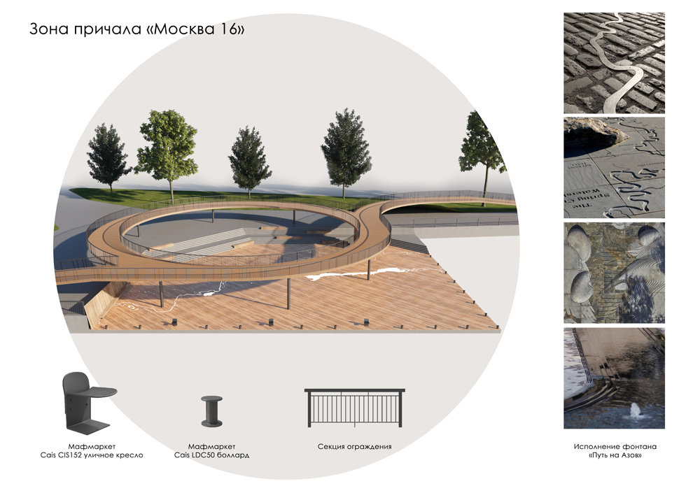 Зону причала «Москва 16» предлагается выполнить в виде двухуровневого деревянного навеса с фонтаном в виде пути на Азов.