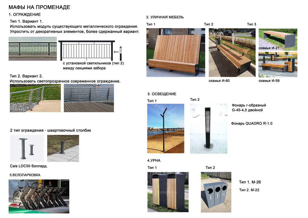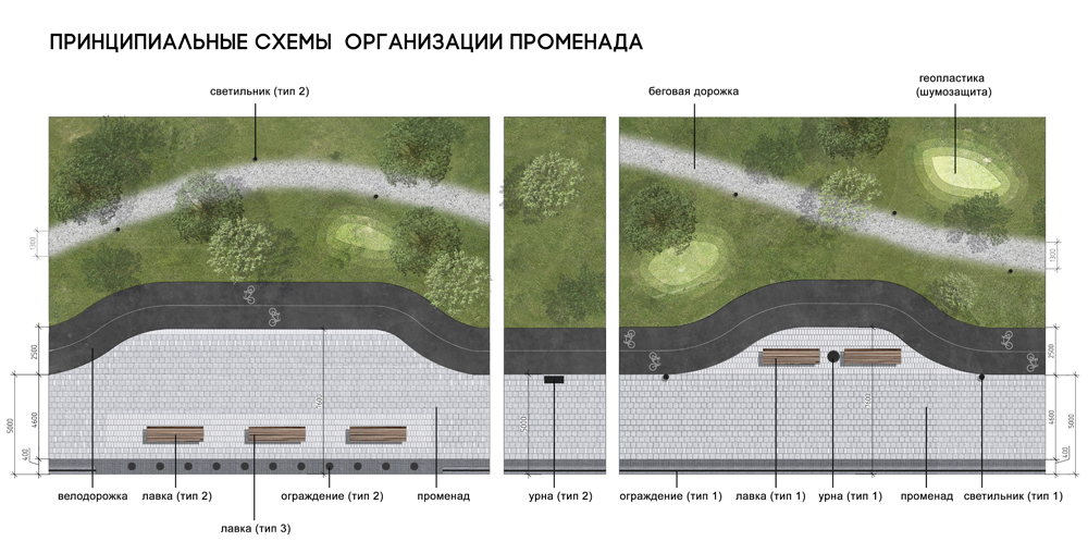 Основной акцент сделан на зоны променада, так как проектируемая территория – привычная всем прогулочная площадка у воды. Пешеходные дорожки могут быть оснащены оригинальными малыми архитектурными формами (скамейками с высокими спинками), ограждением с подсветкой, а утраченные элементы ограждения можно заменить светопрозрачными.