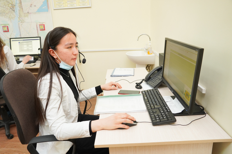 Амина Алижонова надевает наушники с микрофоном: сегодня у нее первое дежурство в колл-центре – плечом к плечу с уже опытными штатными регистраторами. Здесь не спасают жизни, но ответственности хватает. В обязанности входит прием звонков от пациентов, которые могут обратиться с разными жалобами, их запись к врачам по времени, а также контроль состояния коронавирусных пациентов, которые лечатся на дому. Важно максимально подробно изложить в электронной базе суть обращения и, если потребуется, даже первичную клиническую картину.