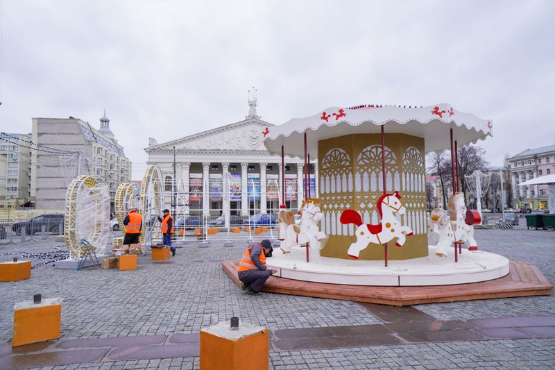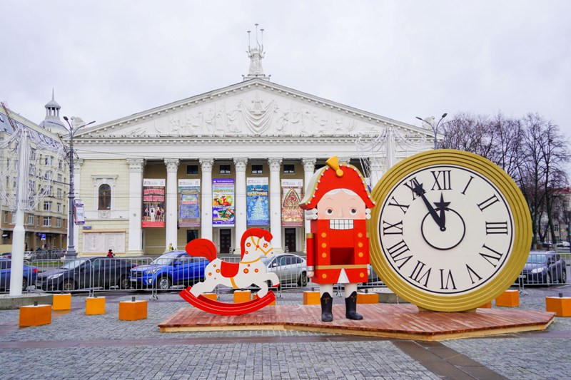 На пл. Ленина уже установлена входная группа «2020», в ней переливаются около двух тысяч огромных шаров. На площади также смонтировали две фотозоны: со стороны Театра оперы и балета установлен «Щелкунчик» с часами. Тут же установлена фотозона-карусель со сказочными лошадками. Сцена сражения Щелкунчика и Мышиного короля, свидетелями которой станут воронежцы и гости города, пока ожидает своей постановки.