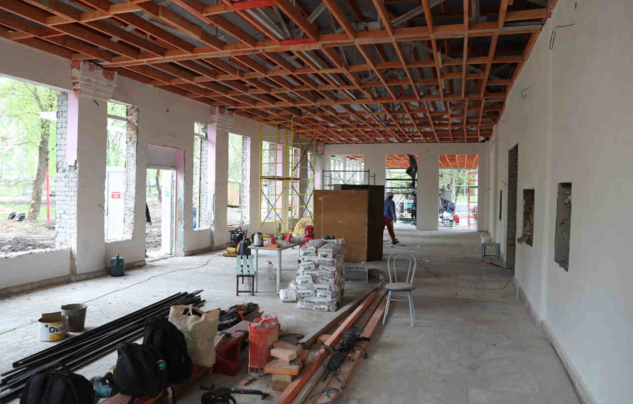 Одним из первых объектов, которые осмотрел глава, стала столовая. Как доложила Любовь Кулакова, от корпуса здесь остались только стены. Крыша, окна, внутренняя отделка были демонтированы. Практически за месяц подрядчики установили новую стропильную систему, утеплили кровлю и настелили на нее покрытие. Сейчас рабочие ведут монтаж коммунальных сетей, штукатурят наружные и внутренние стены. По словам вице-мэра, несмотря на значительный объем работ, ремонт здесь идет с опережением графика.