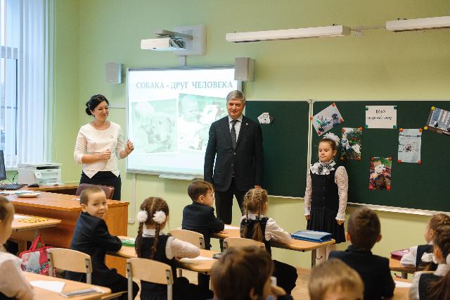 Глава области посетил несколько учебных классов, где шли занятия – по английскому языку, изобразительному искусству, робототехнике. А первоклассники, волнуясь, подарили Александру Гусеву сделанную своими руками декоративную тарелку с изображением главного персонажа знаменитой повести Гавриила Троепольского «Белый Бим Чёрное ухо».