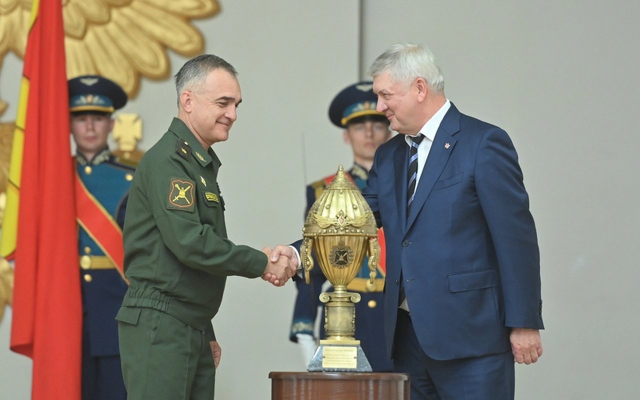 Генерал-майор Александр Туляганов, начальник 2-го управления Главного организационно-мобилизационного управления Генерального штаба ВС РФ, вручил Александру Гусеву переходящий кубок Минобороны за победу в смотре-конкурсе.