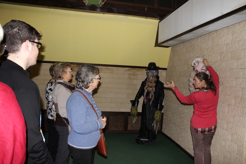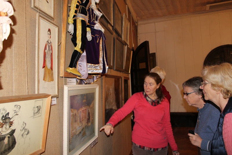 Питерцам предложили подробную экскурсию по чудесному театральному зданию с остановками в самых его зрелищных местах. Для начала, встретив в фойе, ознакомили с богатой историей театра – устами его арт-директора Светланы Дремачёвой. Далее эстафету приняла Елена Луценко – лауреат Государственной премии РСФСР им. К.С. Станиславского, заслуженный художник России, главный художник театра. Елена Леонидовна пригласила гостей на второй этаж, где развернута ее персональная стационарная выставка – авторские куклы плюс макеты костюмов персонажей и декораций спектаклей, уже сошедших с «шутовской» сцены. Рассказ о видах и системах кукол, принципах создания спектаклей с точки зрения сценографа и прочих нюансах объемной работы театрального художника вызвал не только огромный интерес, но и массу вопросов, на которые гости получили исчерпывающие ответы.