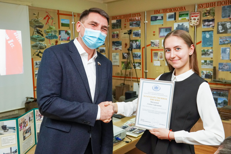 И вот накануне празднования Дня освобождения Воронежа в военно-патриотическом музее при школе № 94 прошла долгожданная встреча юнармейцев с Николаем Борисовым, которая была организована при поддержке Совета отцов Воронежской области. Правда, из-за карантинных ограничений, связанных с пандемией коронавируса, встреча прошла в дистанционном формате – Николай Николаевич выступил перед школьниками в онлайн-формате по интернет-связи. Зато на встрече вживую – но с соблюдением всех санитарно-эпидемиологических норм – присутствовал депутат Государственной Думы ФС РФ Андрей Марков.