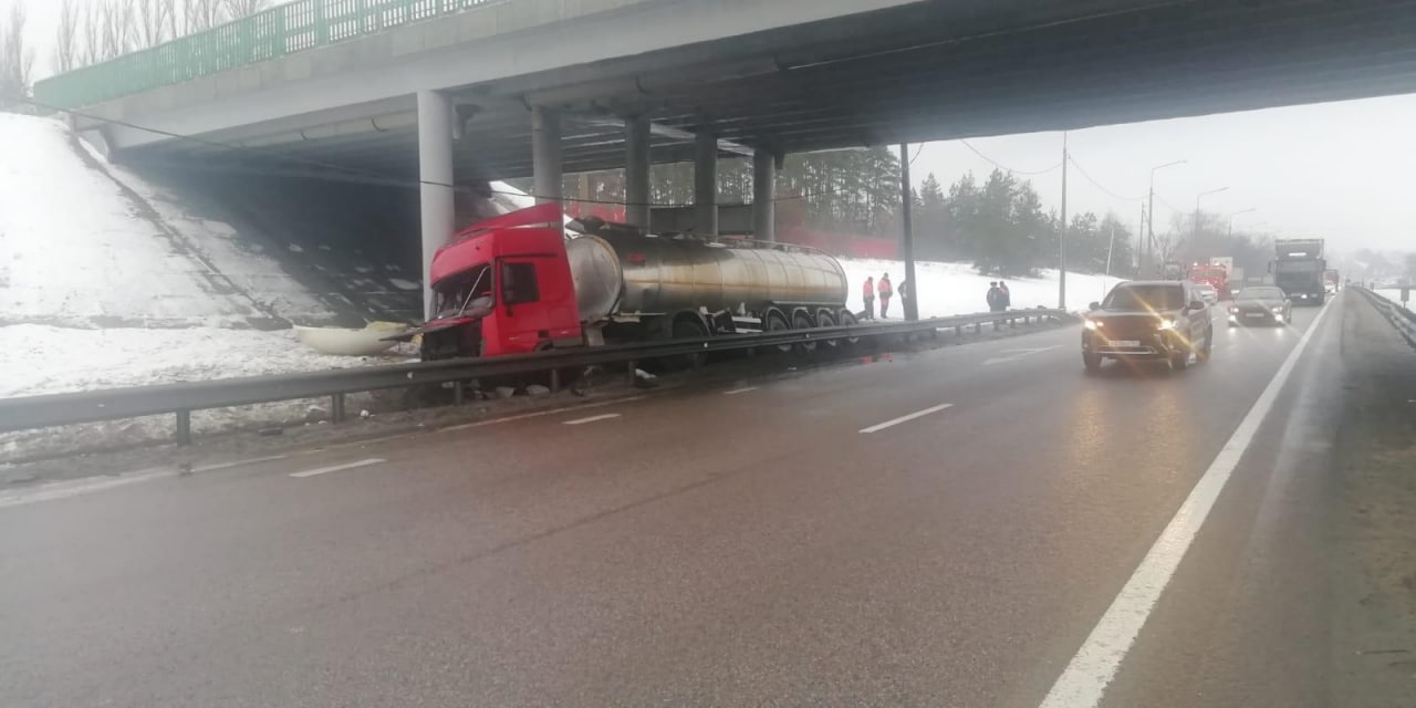 Авария произошла в 6.30 утра на 482 км трассы М-4 «Дон». Здесь 49-летний водитель фуры «Мерседес Бенц» с полуприцепом не справился с управлением своей машины. В результате автоцистерна врезалась в дорожное ограждение, а затем и съехала в кювет.