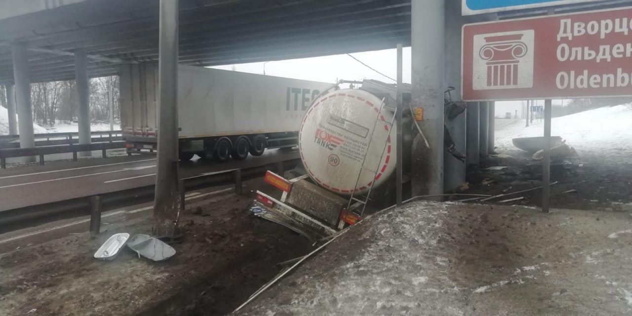 Здесь бы она и перевернулась, но падение фуры было остановлено опорой моста: авария произошла аккурат под путепроводом.