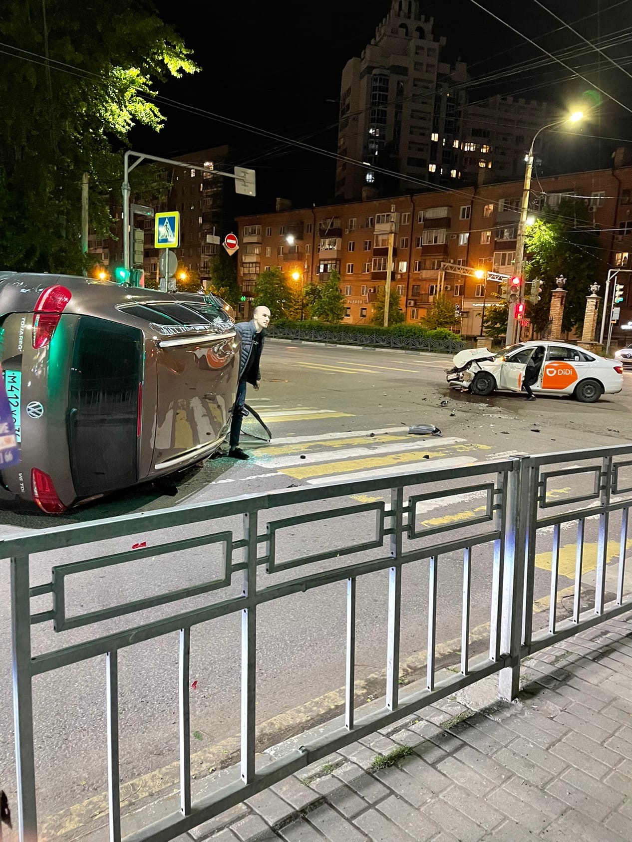 Участников аварии – двое: кроссовер «Фольксваген Туарег» и автомобиль «Лада Веста» с маркировкой агрегатора такси DiDi. Удар получился столь сильным, что иномарка опрокинулась.