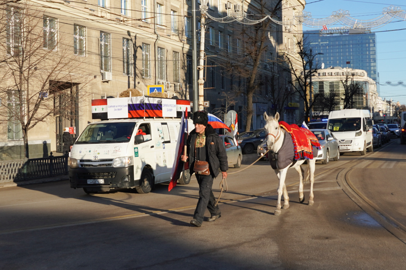 Более 6,5 тыс. километров уже преодолел Аднан Азам. Позади Багдад, Тегеран, Дагестан, Чечня. В конце ноября путешественник добрался до Ростовской области, а сегодня – он в Воронеже. Почти не спал – торопился на встречу. Прежде чем устроить «привал», Аднан Аззам заботится о лошади. Весь ее корм, а также необходимые для дальнего путешествия вещи, находятся в автомобиле, который на протяжении всего пути следует за сирийцем на скорости 3 км/ч.