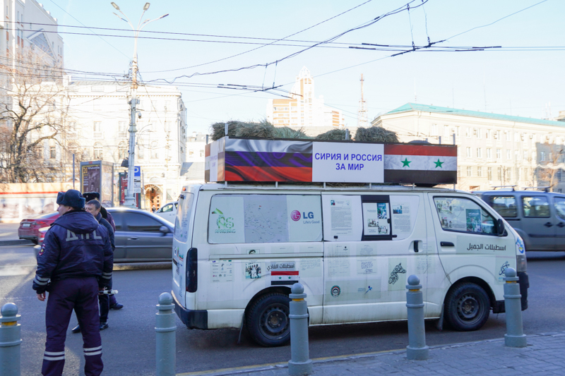 Аднан Аззам несет в руках два флага – Сирии и России. Само путешествие носит в том числе задачу показать единство государств в борьбе с терроризмом. К повышенному вниманию путешественник давно привык. Про него уже знают, пытаются накормить и предлагают ночлег, нередко просят о совместном фото.