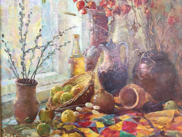 Не менее, на мой взгляд, интересны жанровые картины, исполненные большей частью в теплых «деревенских» мотивах: дощатый мостик на камышовом озере, аккуратные курочки у покосившегося забора. Есть и отражения бурной творческой жизни Калача – как, например, яркая масштабная иллюстрация к проводимому на этой земле фестивалю хлеба. В натюрмортах и портретах авторы подчеркнуто оригинальны на уровне идеи: собственное видение предмета в ряде работ определенно в наличии.