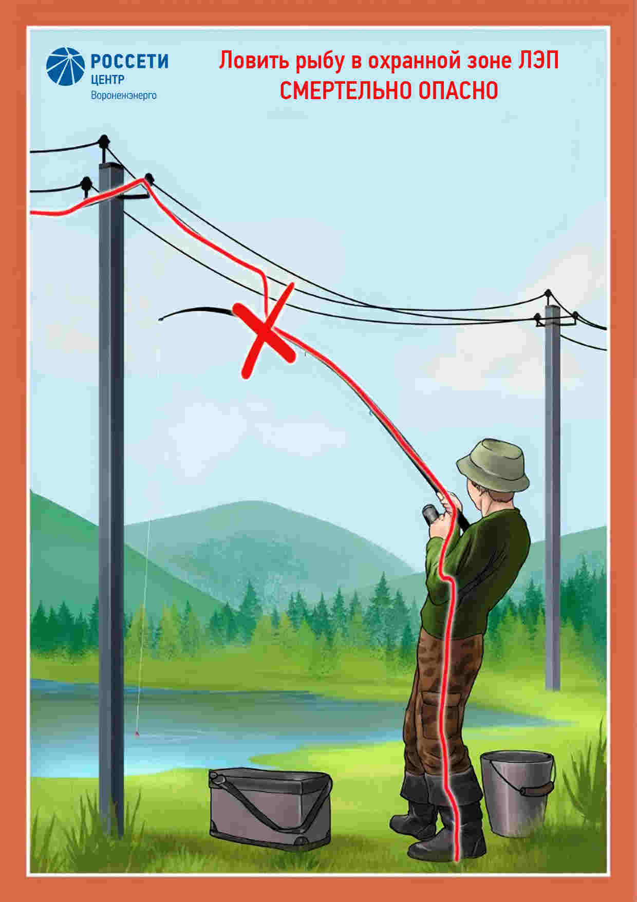 – Вблизи действующих линий электропередачи рыбачить нельзя! Длина некоторых удочек больше, чем расстояние от земли до провода линии электропередачи. Приближение удочки к проводу, который находится под напряжением, опасно для жизни;