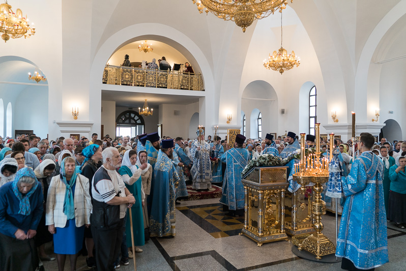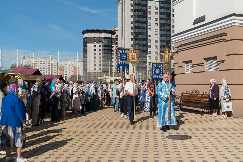 После Литургии был совершен праздничный молебен Божией Матери. Духовенство и богомольцы обошли вокруг храма с иконой Пресвятой Богородицы. На четырех сторонах храма священнослужители окропляли молящихся святой водой.