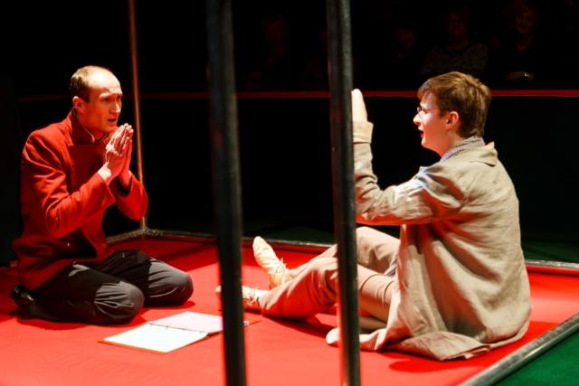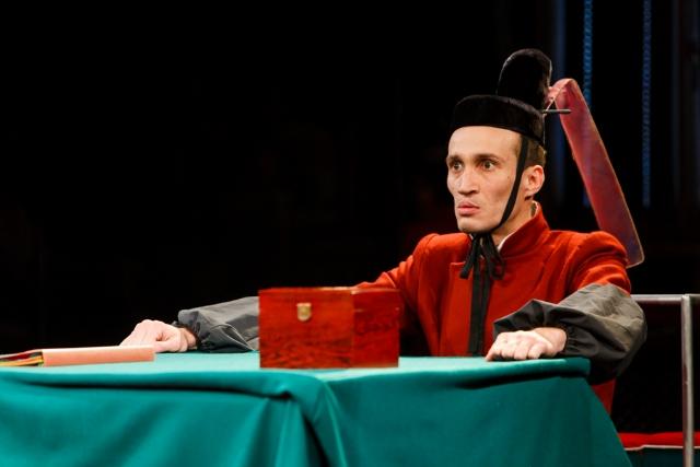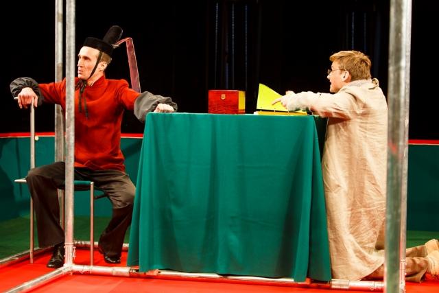 Спектакль был задуман как остроумный парадокс, в котором тривиальная история раскрывается с нетривиальной стороны. Это увлекательный психологический поединок – спор талантливого комедийного автора и цензора, напрочь лишенного чувства юмора, и то, к чему он приводит. Словесные баталии с претензией на переубеждение, попытка «поменяться ролями» и, конечно же, взятка – чем еще задобрить неуступчивого цензора? Итог – не просто примирение сторон или победа одного над другим, а возвышение искусства, осознание его подлинных целей. Играли спектакль Вячеслав Гардер, исполнивший роль офицера службы безопасности отдела цензуры Мацуо Сакисака, и Егор Козаченко, воплотивший в этом спектакле образ драматурга Хадзими Цубаки, пишущего для театральной труппы «Академия смеха».
