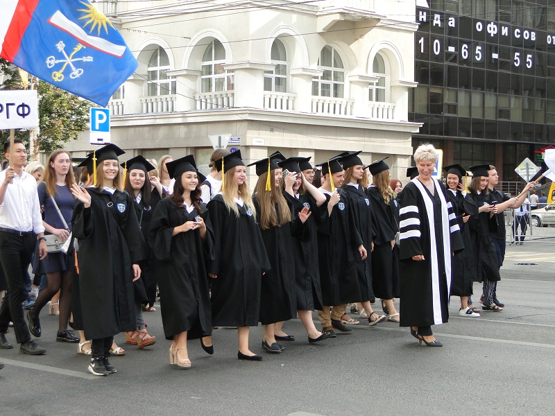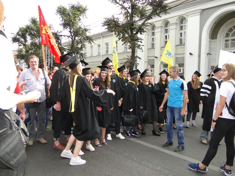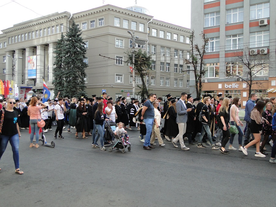 В 9 часов утра центр Воронежа был разбужен дружным и задорным «ура!» – это полторы тысячи студентов ВГУ, нынешних и давно покинувших альма-матер, проживающих как в России, так и в других странах, вольным парадом под аккомпанемент сводного духового оркестра Воронежской филармонии прошли по проспекту Революции от башни ЮВЖД до Никитинской площади. Среди иностранных гостей праздника в колоннах шли выпускники ВГУ из Китая, Великобритании, Арабских Эмиратов, Испании, Германии.