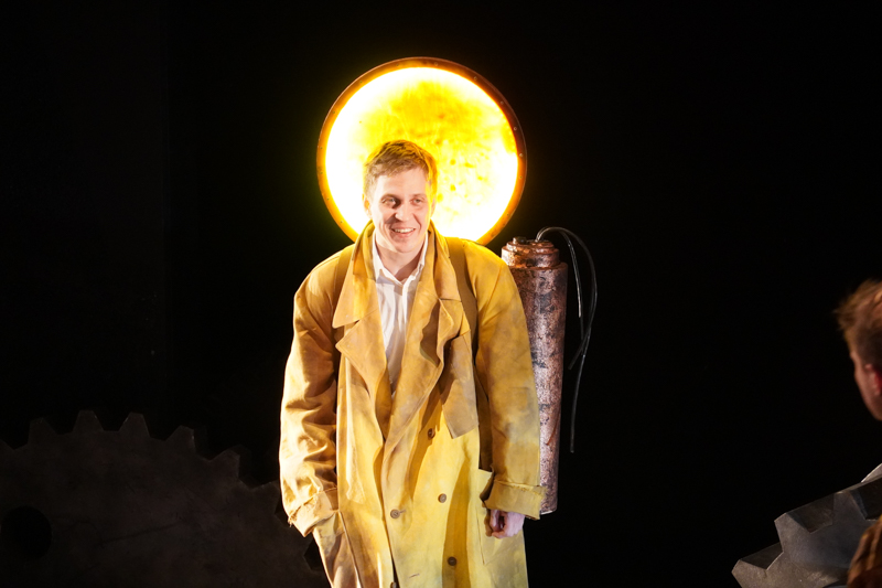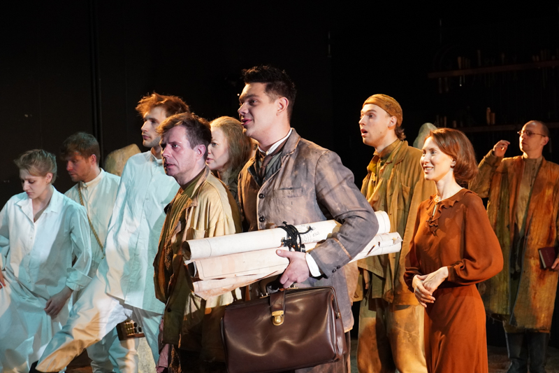 Переплетения тут же нашлись: из повести «Впрок» режиссер берет «искусственное солнце», символизирующее электричество, из рассказа «Сатана мысли» – образ Вогулова (его качествами Назарова наделяет в спектакле инженера-электрика Николая Вермо). Скрепой текстов между собой стала апокалиптическая тематика: люди, строящие новую вселенную, возомнили себя божеством, решив, что создать новый мир им под силу.