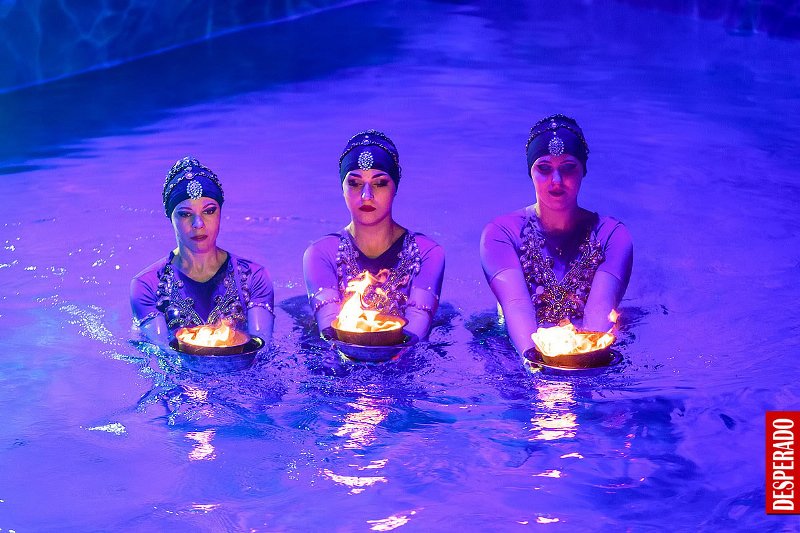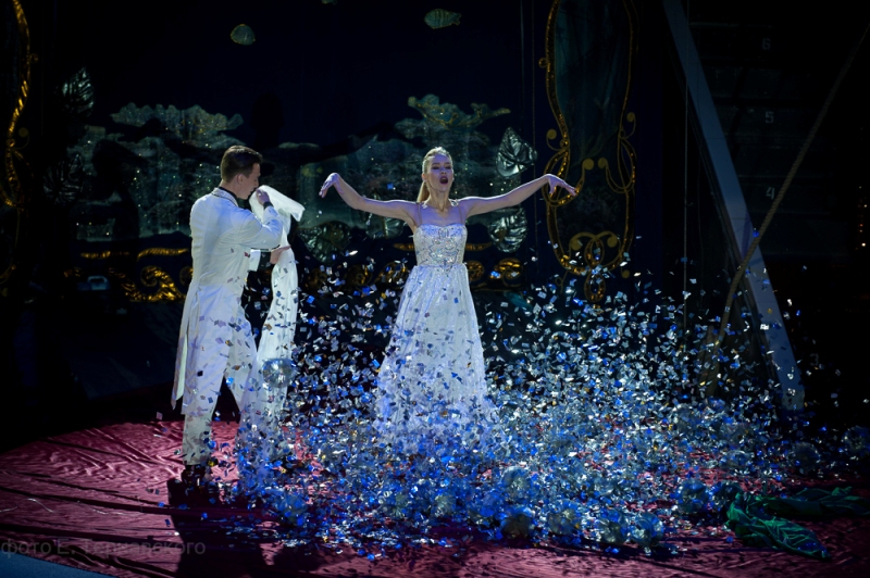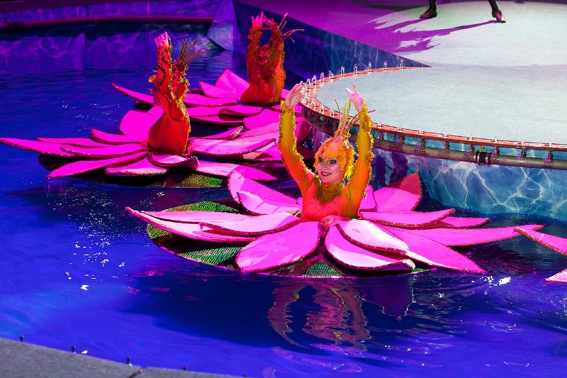 На целый месяц цирковой манеж превратится в огромное озеро с 15-метровыми фонтанами и каскадами водопадов, а захватывающая игра света создаст чувство невероятности происходящего, ощущение волшебной сказки – бесконечной и прекрасной. Обнажившийся в центре островок суши превратится в цветущий сад, где танцуют грациозные нимфы и наяды, здесь можно будет увидеть распускающиеся цветы лотоса, танцующих русалок и медуз.