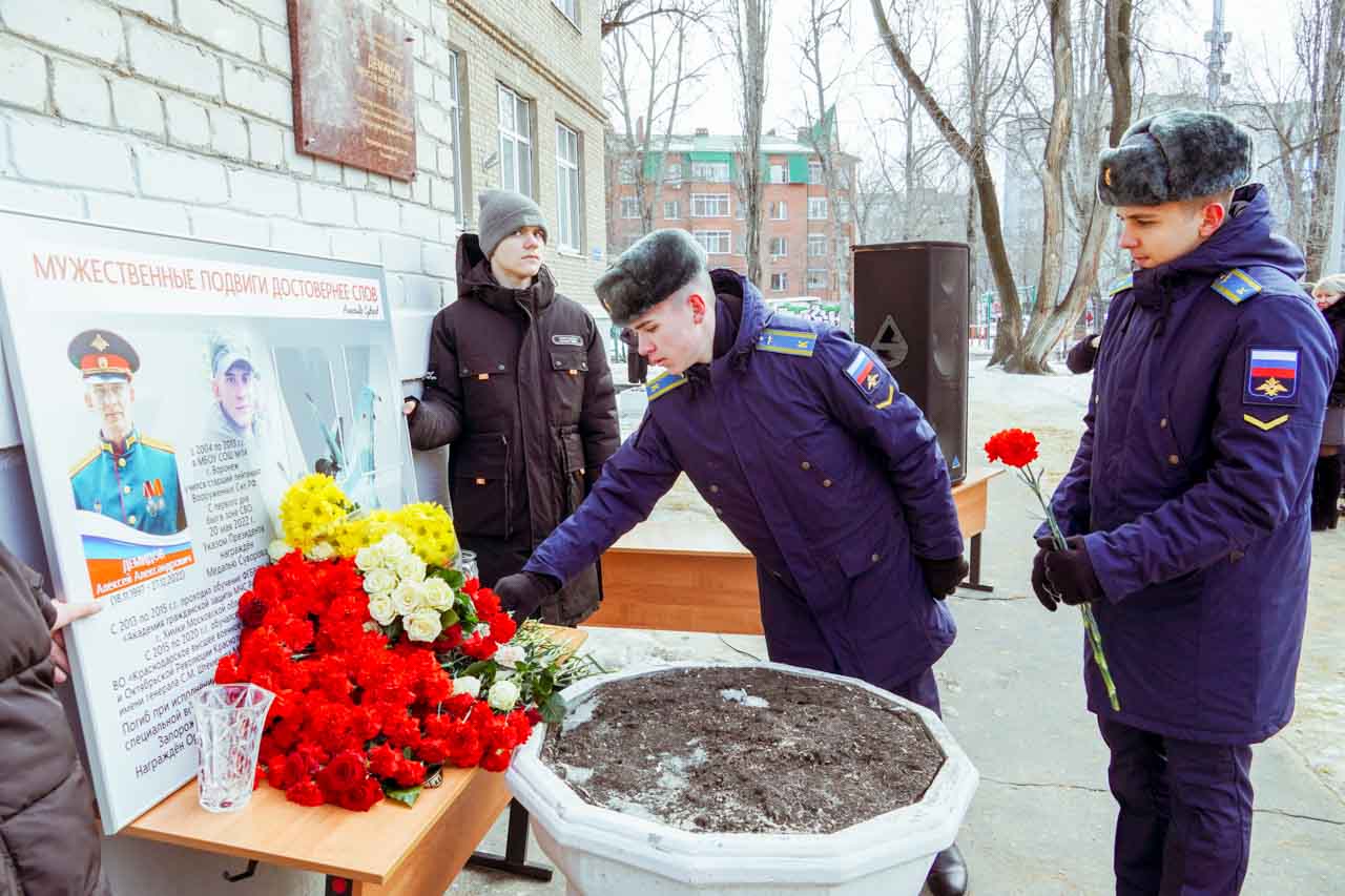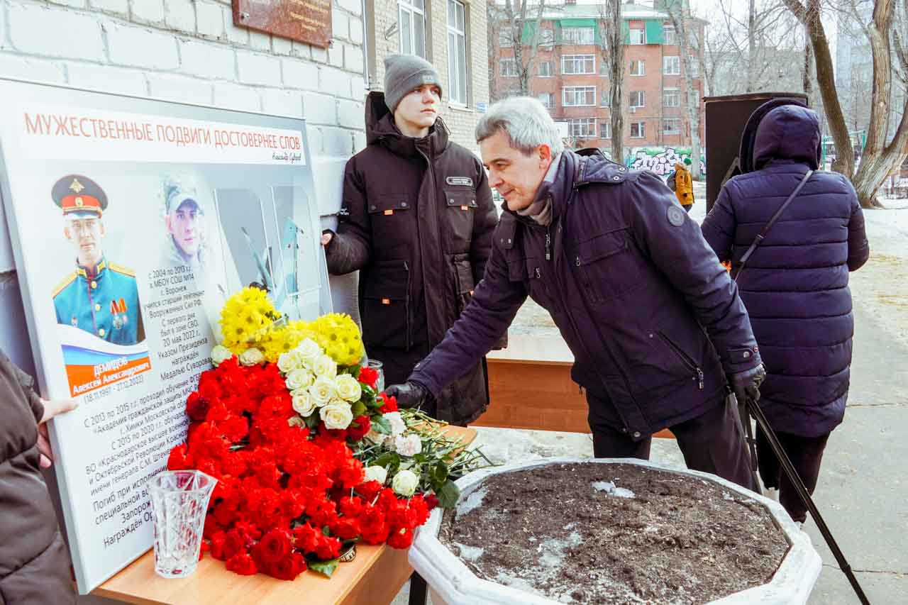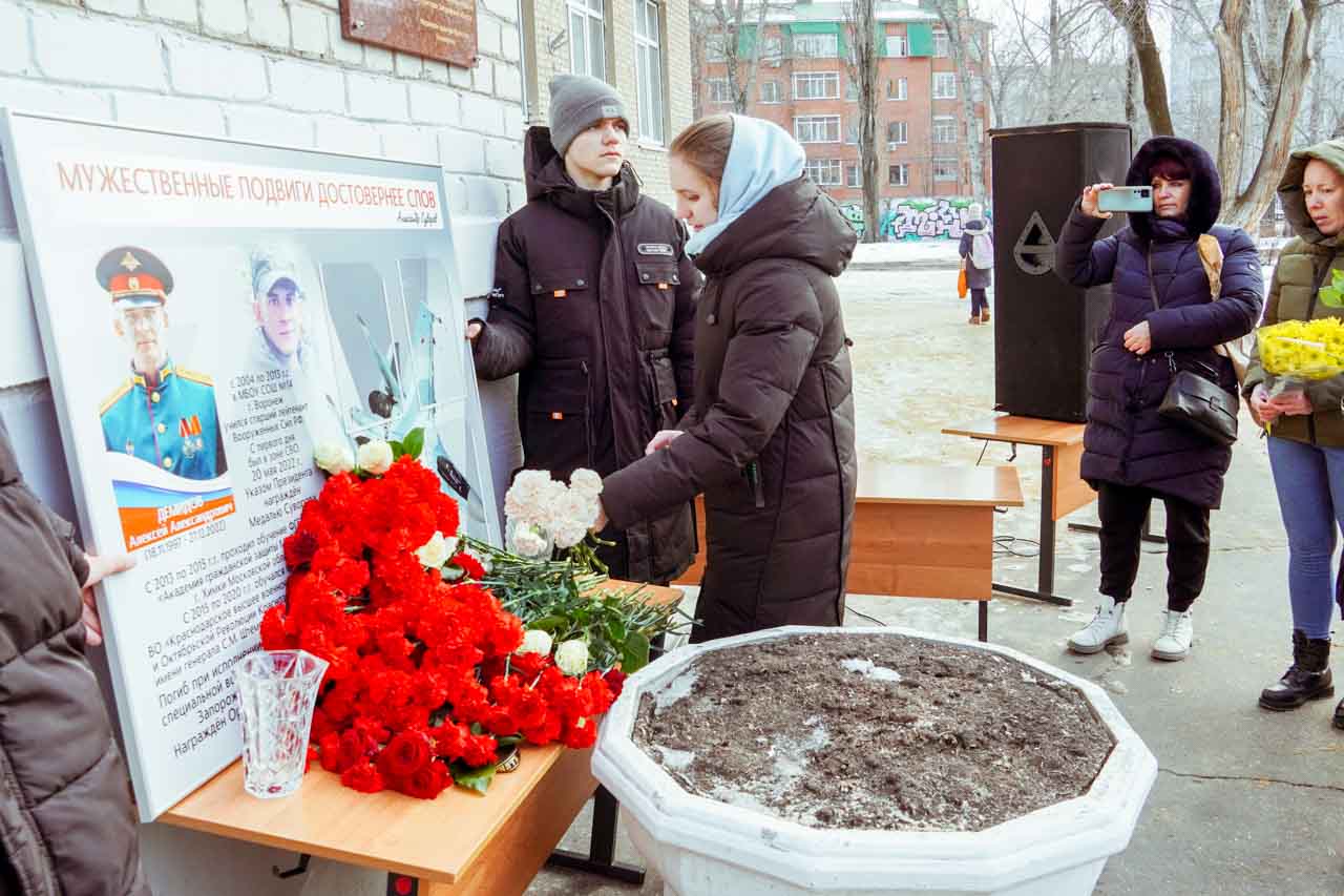 В школьном дворе собрались в этот день друзья и одноклассники героя, его родители и супруга, учащиеся образовательной организации и педагоги, представители управы Ленинского района, Совета ветеранов, регионального фонда «Защитники Отечества», а также коллеги Алексея Демидова из Военно-воздушной академии им. Жуковского и Гагарина. Памятное мероприятие началось с поднятия флага Российской Федерации.