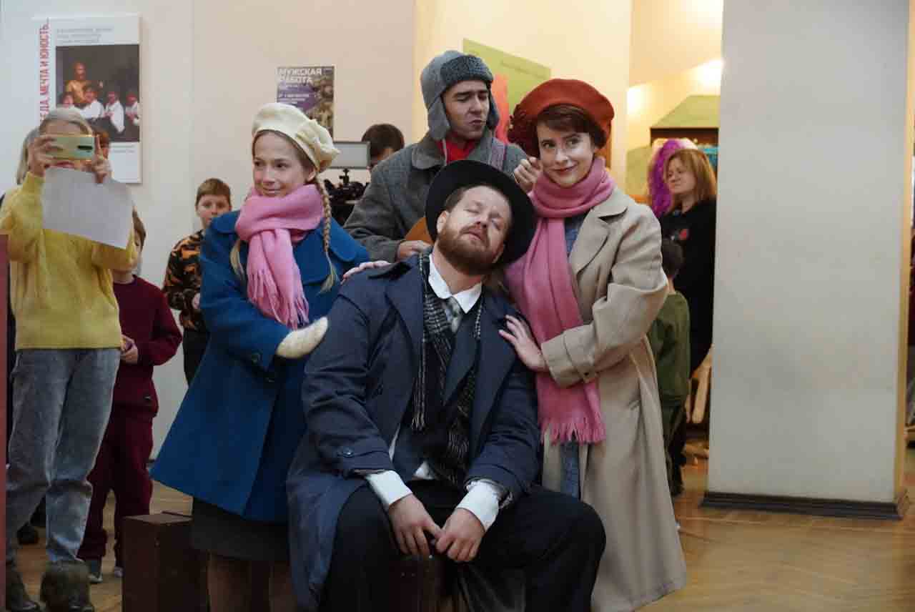 Мини-спектакль развернулся в фойе первого этажа, перед спектаклем «Золушка». Начинается интермедия незаметно – актеры появляются среди ничего не подозревающих зрителей, которые ожидают спектакль. Тут и харизматичный начальник железнодорожной станции, объявляющий в громкоговоритель посадку на поезд, и Рассеянный с улицы Бассейной, и Дама, сдающая в багаж «картинку, корзинку, картонку и маленькую собачонку».