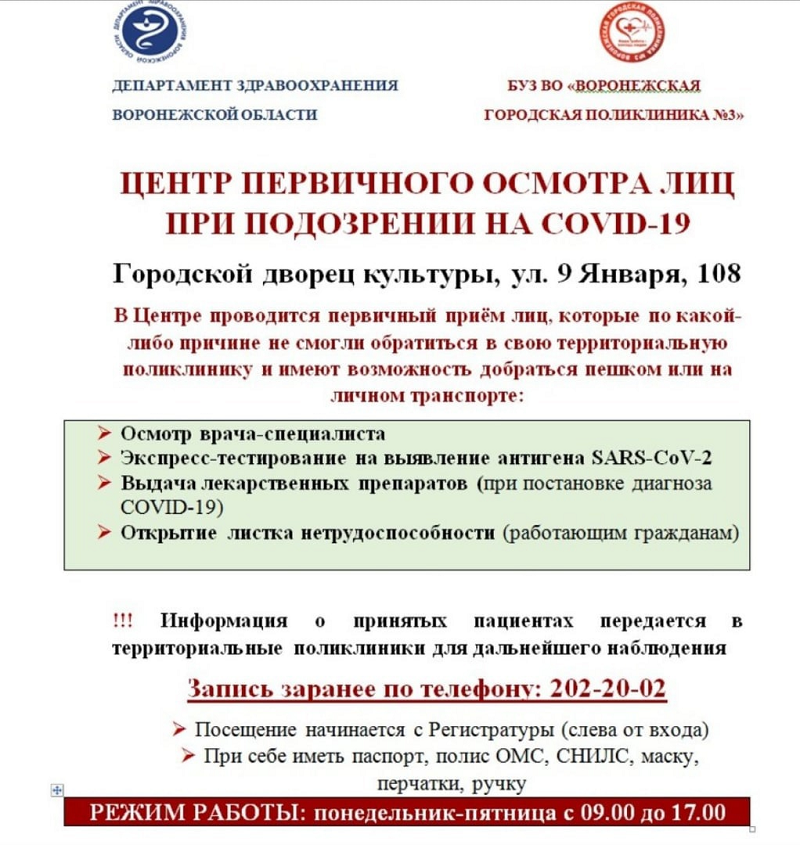 В облздраве подчеркнули, что приехать в ДК могут все воронежцы, которые по каким-либо причинам не смогли обратиться в свою поликлинику. Но при этом горожанам рекомендовано записаться на прием предварительно по телефону 202-20-02. С собой необходимо приносить стандартный набор документов: паспорт, полис медицинского страхования и СНИЛС.