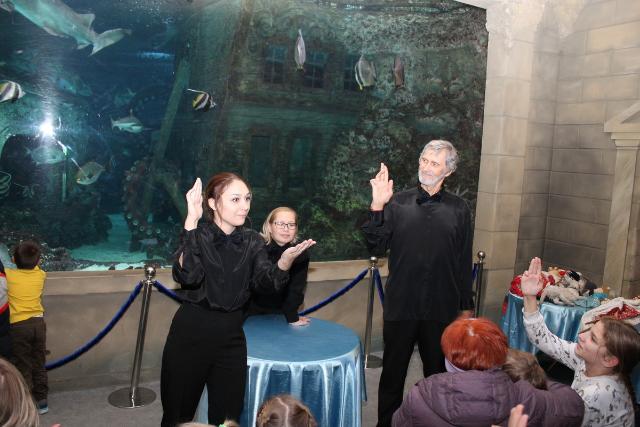 Выступление актёров прошло у большого аквариума с акулами, на фоне которого кукольные «деяния» смотрелись особенно экзотично. Представьте себе озорного Буратино, сующего свой любопытный нос в полумрак приаквариумного пространства – зрелище практически сюрреалистичное. Или трогательного бедолагу Бимку, над умной головой которого проплывает острозубый морской хищник, пусть и за толстым стеклом; на кого тут смотреть – глаза разбегаются.