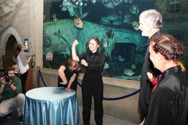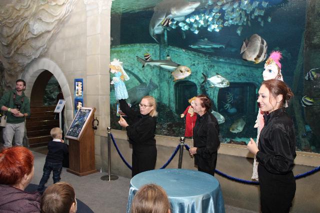 Выступление актёров прошло у большого аквариума с акулами, на фоне которого кукольные «деяния» смотрелись особенно экзотично. Представьте себе озорного Буратино, сующего свой любопытный нос в полумрак приаквариумного пространства – зрелище практически сюрреалистичное. Или трогательного бедолагу Бимку, над умной головой которого проплывает острозубый морской хищник, пусть и за толстым стеклом; на кого тут смотреть – глаза разбегаются.