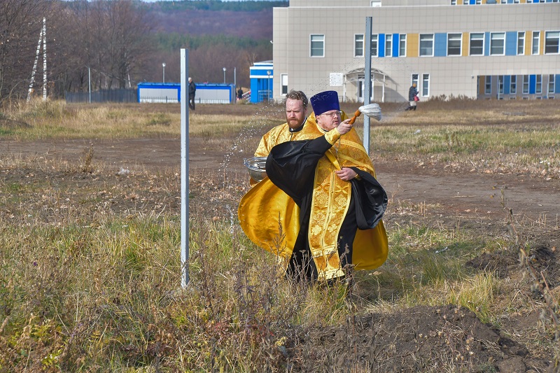 В завершение молебна отец Андрей и отец Сергий окропили молящихся и территорию будущей стройки святой водой.