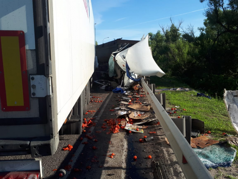 Движение на этом и без того узком участке трассы сейчас осуществляется по одной полосе в реверсном режиме, поскольку вторую полосу перегородили разбитые фуры.