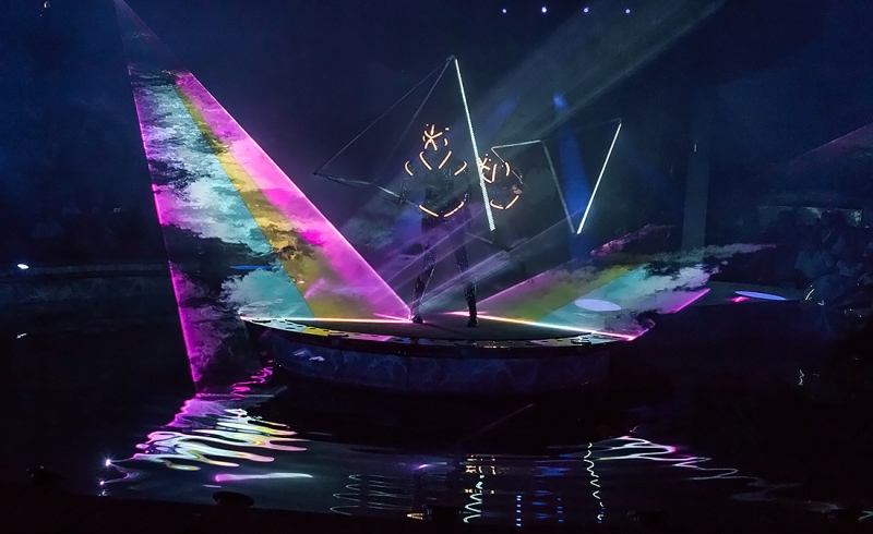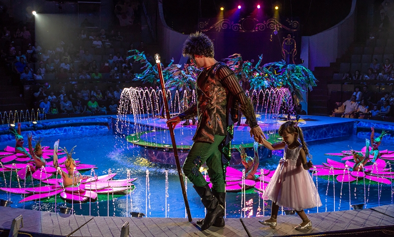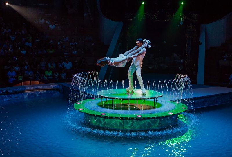 Вообще в программе задействовано много животных – морские львы, морской котик, крокодил, питоны и прочие змеи, дикобразы, несколько видов обезьян и попугаев… Все номера животные выполняют, находясь на островке посреди водной глади. А рядом то и дело бьют фонтаны различной высоты, меняя окраску воды. Свою роль в программе играют и лазерные установки, которые создают ощущение другой реальности. Значительный блок программы составляют танцевальные номера. В общем, зрелище – умопомрачительное, и за 2,5 часа, что длится представление, зритель не успевает заскучать ни на секунду!