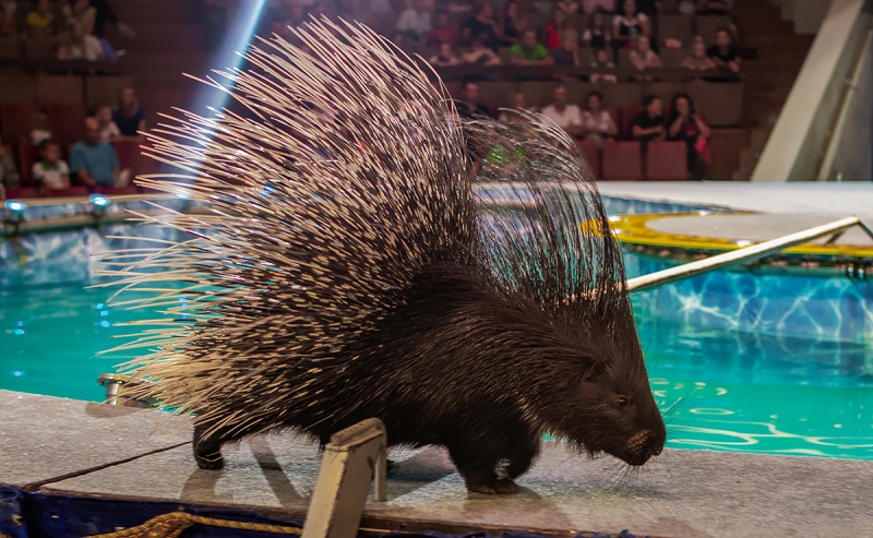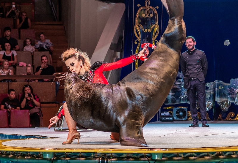 – Учитывая, что интеллект у морских котиков очень высокий, то поддаются дрессуре они довольно легко, – рассказывает дрессировщица. – Однако эти животные не любят принуждения. Поводок на них не наденешь, да и телесных наказаний не может быть. У них очень тонкая душевная организация, они и так все прекрасно понимают. Иногда они вообще инициативу проявляют на манеже. Встать, сесть, похлопать ластами – не интересно, им хочется как можно ярче выразить свою творческую натуру. Главное, чтобы предметы, с которыми котики выступают, были им знакомы, чтобы они к ним привыкли. Если идет дрессура на обруче, то нужно показать все нюансы. Порой на представлении, когда дети сильно кричат, машут лазерными игрушками, это может отвлечь артистов, и здесь важно, чтобы они переключились на знакомые им предметы, например, шарик.