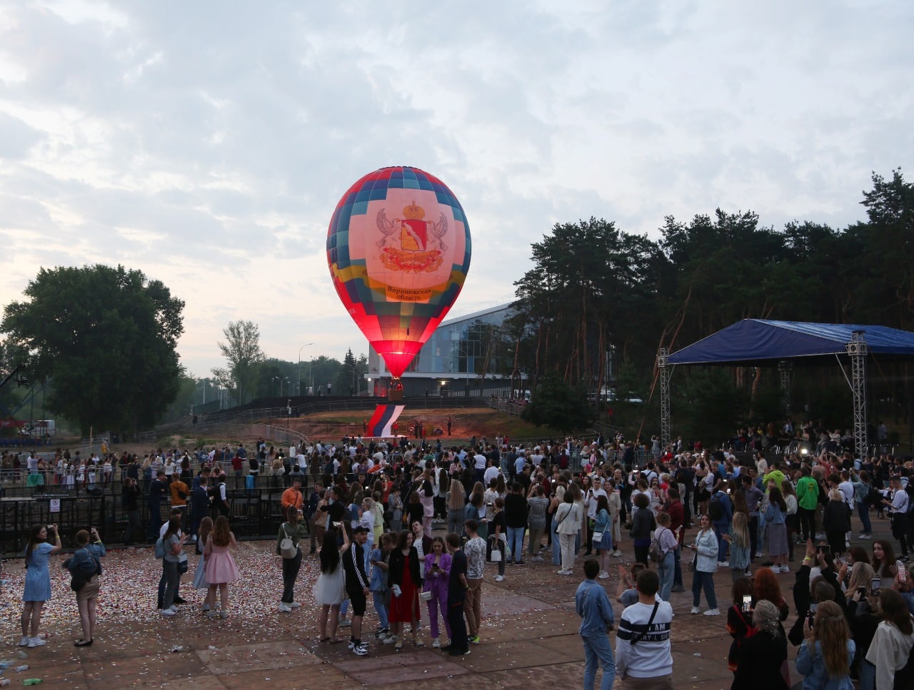 Самая романтическая часть выпускного — совместная встреча летнего рассвета. И здесь ребят ждал сюрприз — в небо было выпущено пять аэростатов с символикой Воронежской области и выпускного.